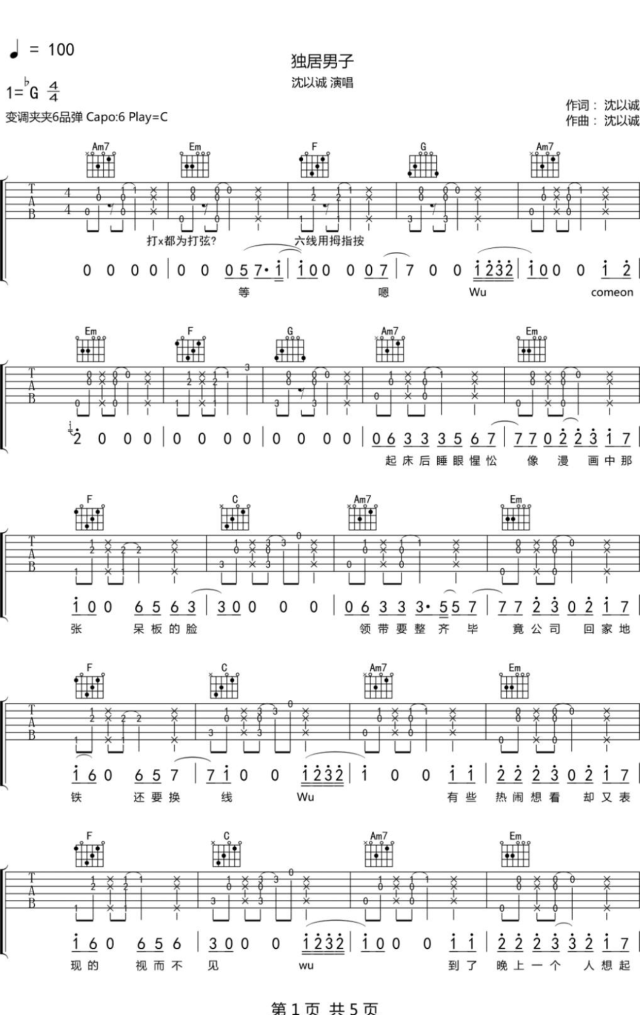 《沈以诚《独居男子吉他谱》(G调)》内容来自于互联网,不能保证内容的准确性与完整性,仅供学习交流欣赏,请勿用于其它用途,内容版权归原作者及来源网站所有,如有侵犯到您的权益请来信告知,我们将及时删除。