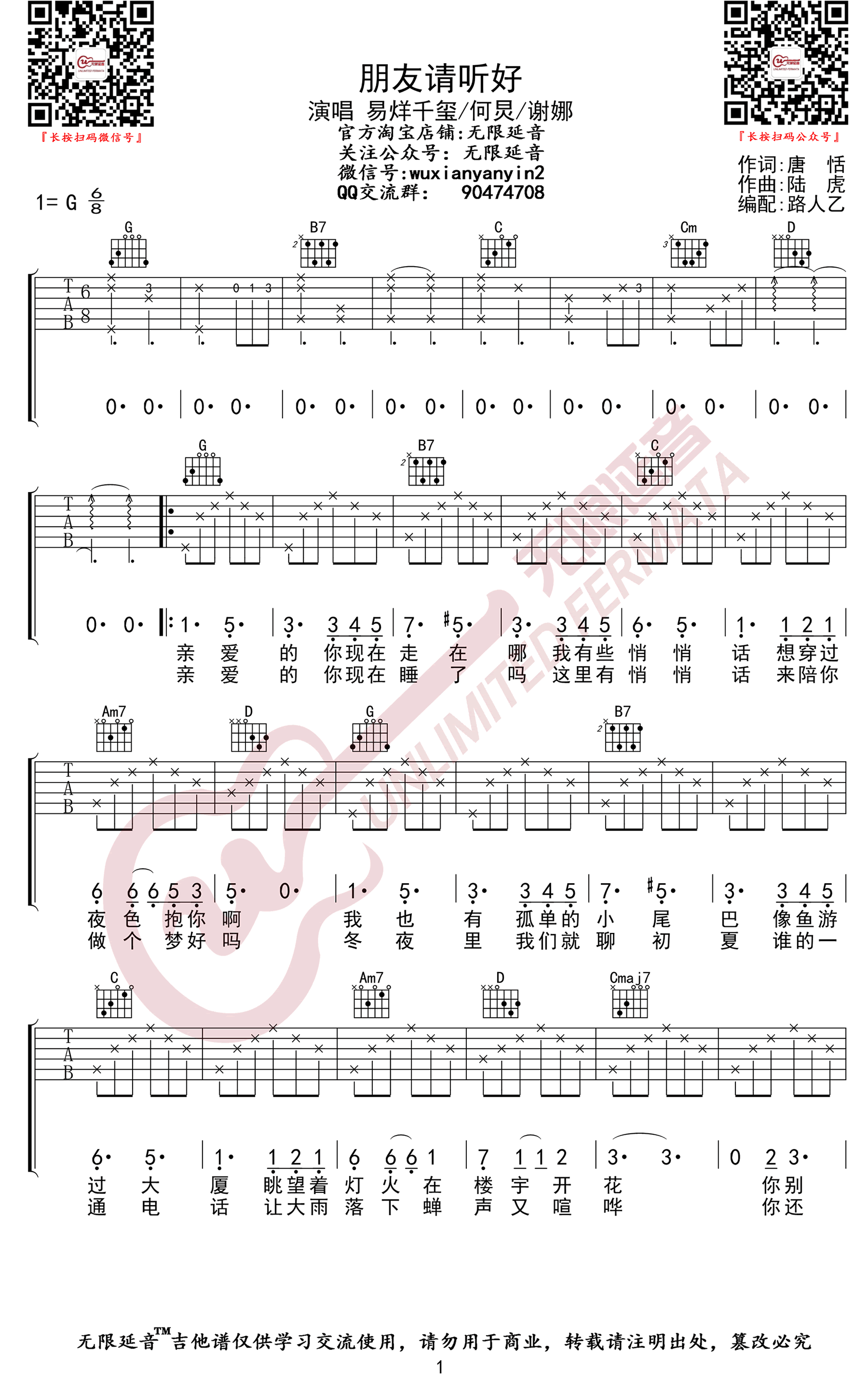 《易烊千玺《朋友请听好吉他谱》(G调)》内容来自于互联网,不能保证内容的准确性与完整性,仅供学习交流欣赏,请勿用于其它用途,内容版权归原作者及来源网站所有,如有侵犯到您的权益请来信告知,我们将及时删除。