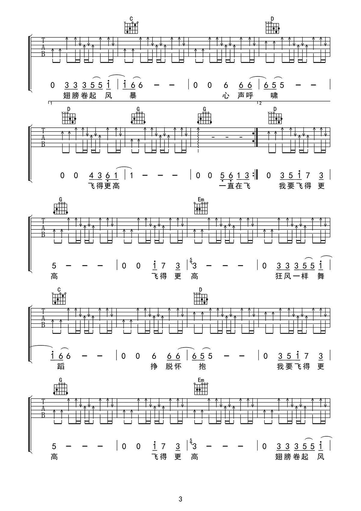 《汪峰《飞得更高吉他谱》(C调)》内容来自于互联网,不能保证内容的准确性与完整性,仅供学习交流欣赏,请勿用于其它用途,内容版权归原作者及来源网站所有,如有侵犯到您的权益请来信告知,我们将及时删除。