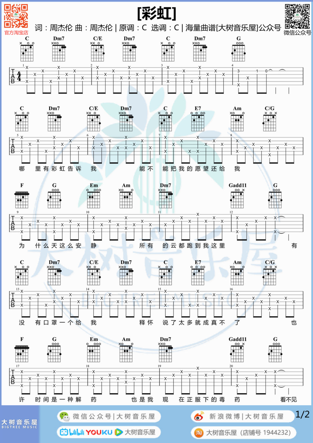《周杰伦《彩虹吉他谱》(C调)》内容来自于互联网,不能保证内容的准确性与完整性,仅供学习交流欣赏,请勿用于其它用途,内容版权归原作者及来源网站所有,如有侵犯到您的权益请来信告知,我们将及时删除。