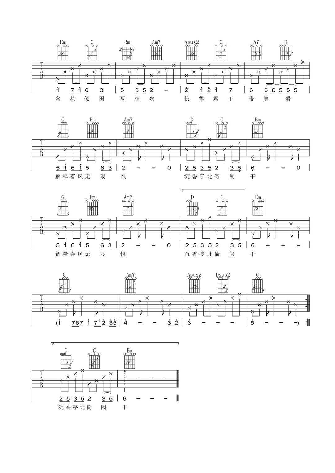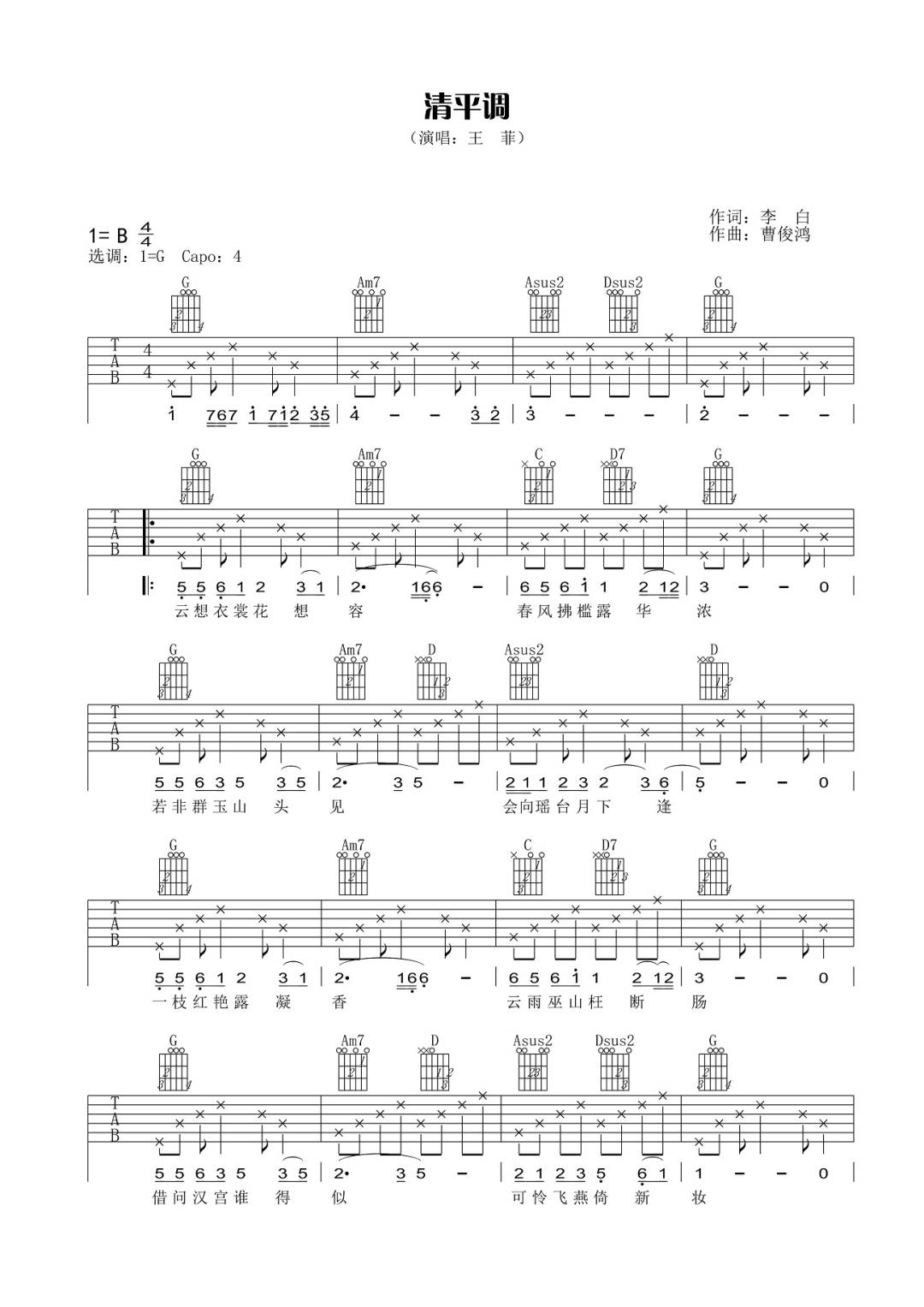 王菲《清平调吉他谱》(C调)
