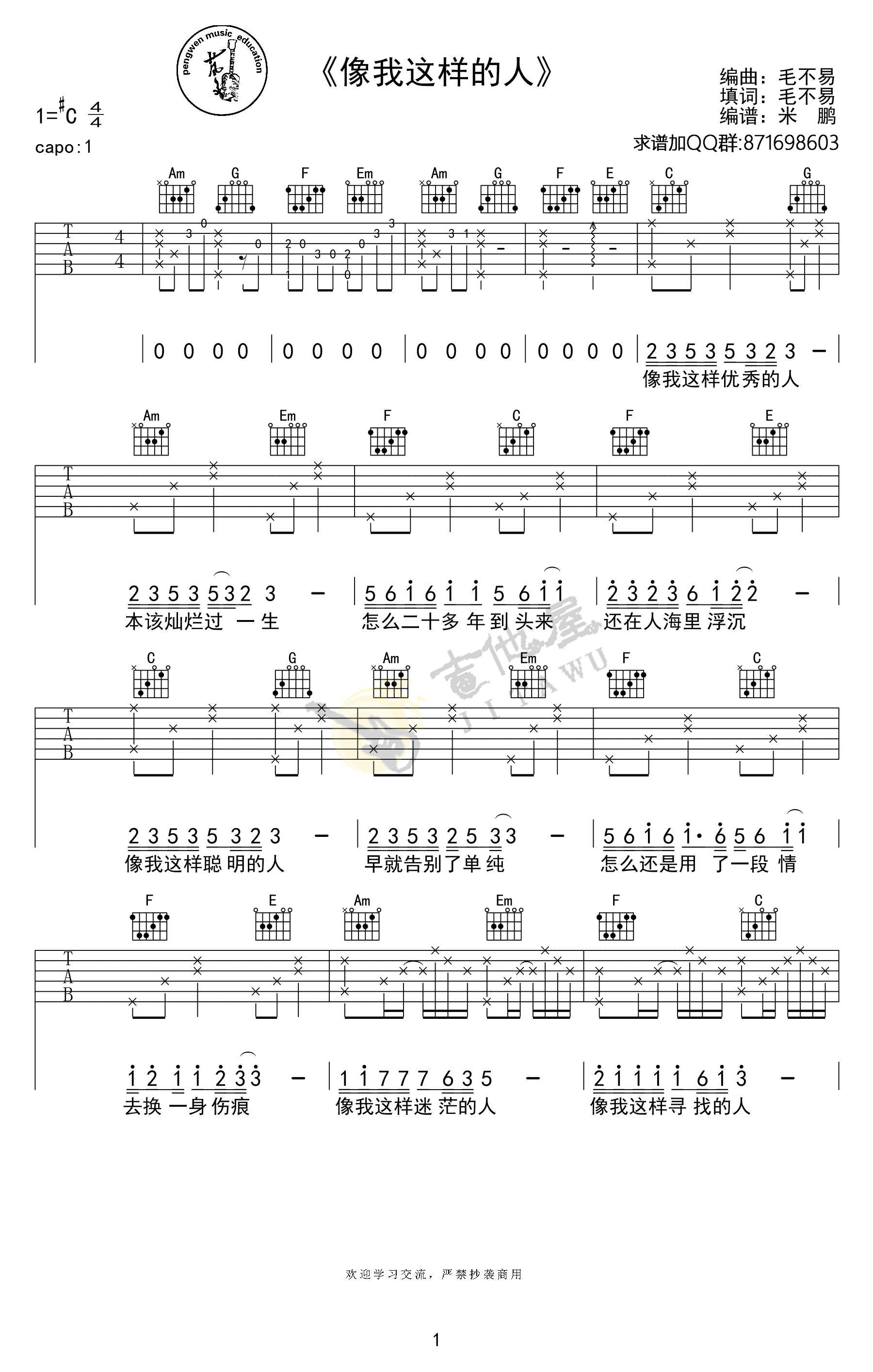 《毛不易《像我这样的人吉他谱》(C调)》内容来自于互联网,不能保证内容的准确性与完整性,仅供学习交流欣赏,请勿用于其它用途,内容版权归原作者及来源网站所有,如有侵犯到您的权益请来信告知,我们将及时删除。