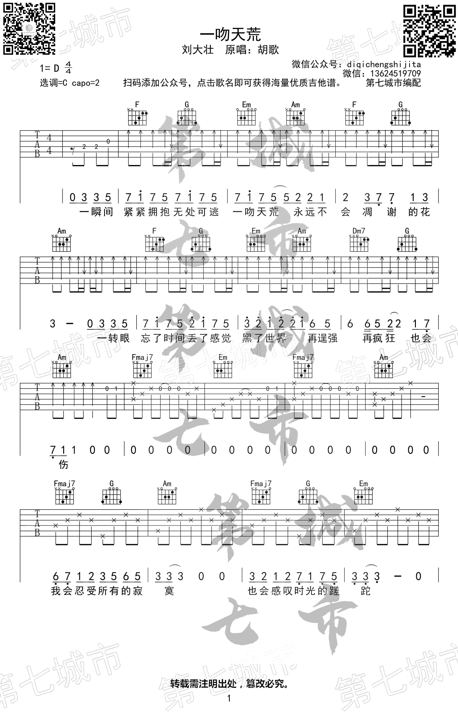 《刘大壮《一吻天荒吉他谱》(G调)》内容来自于互联网,不能保证内容的准确性与完整性,仅供学习交流欣赏,请勿用于其它用途,内容版权归原作者及来源网站所有,如有侵犯到您的权益请来信告知,我们将及时删除。