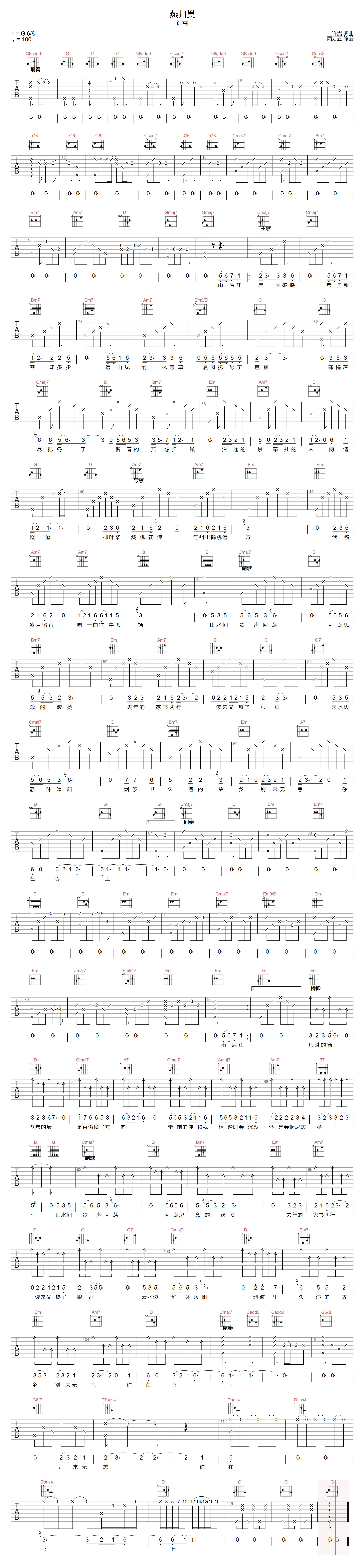 《许嵩《燕归巢吉他谱》(C调)》内容来自于互联网,不能保证内容的准确性与完整性,仅供学习交流欣赏,请勿用于其它用途,内容版权归原作者及来源网站所有,如有侵犯到您的权益请来信告知,我们将及时删除。