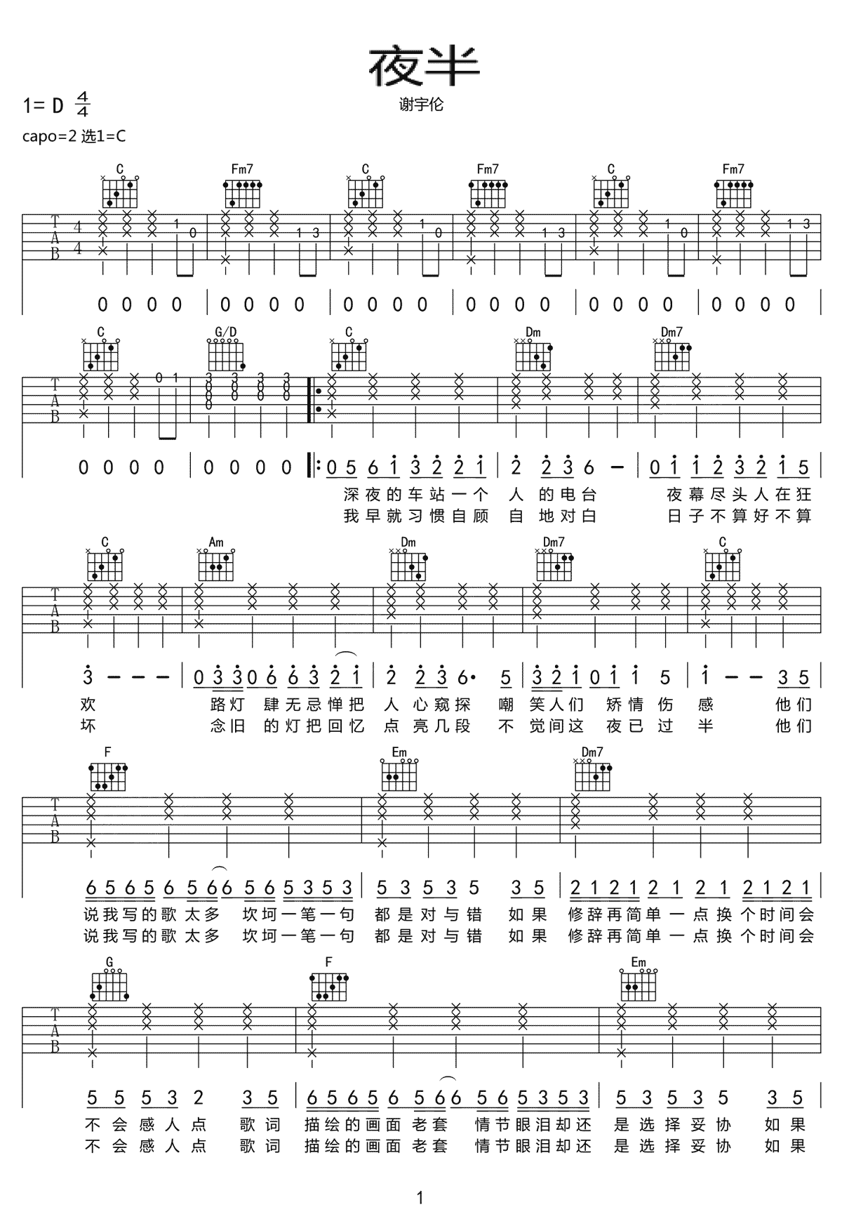 《谢宇伦《夜半吉他谱》(D调)》内容来自于互联网,不能保证内容的准确性与完整性,仅供学习交流欣赏,请勿用于其它用途,内容版权归原作者及来源网站所有,如有侵犯到您的权益请来信告知,我们将及时删除。