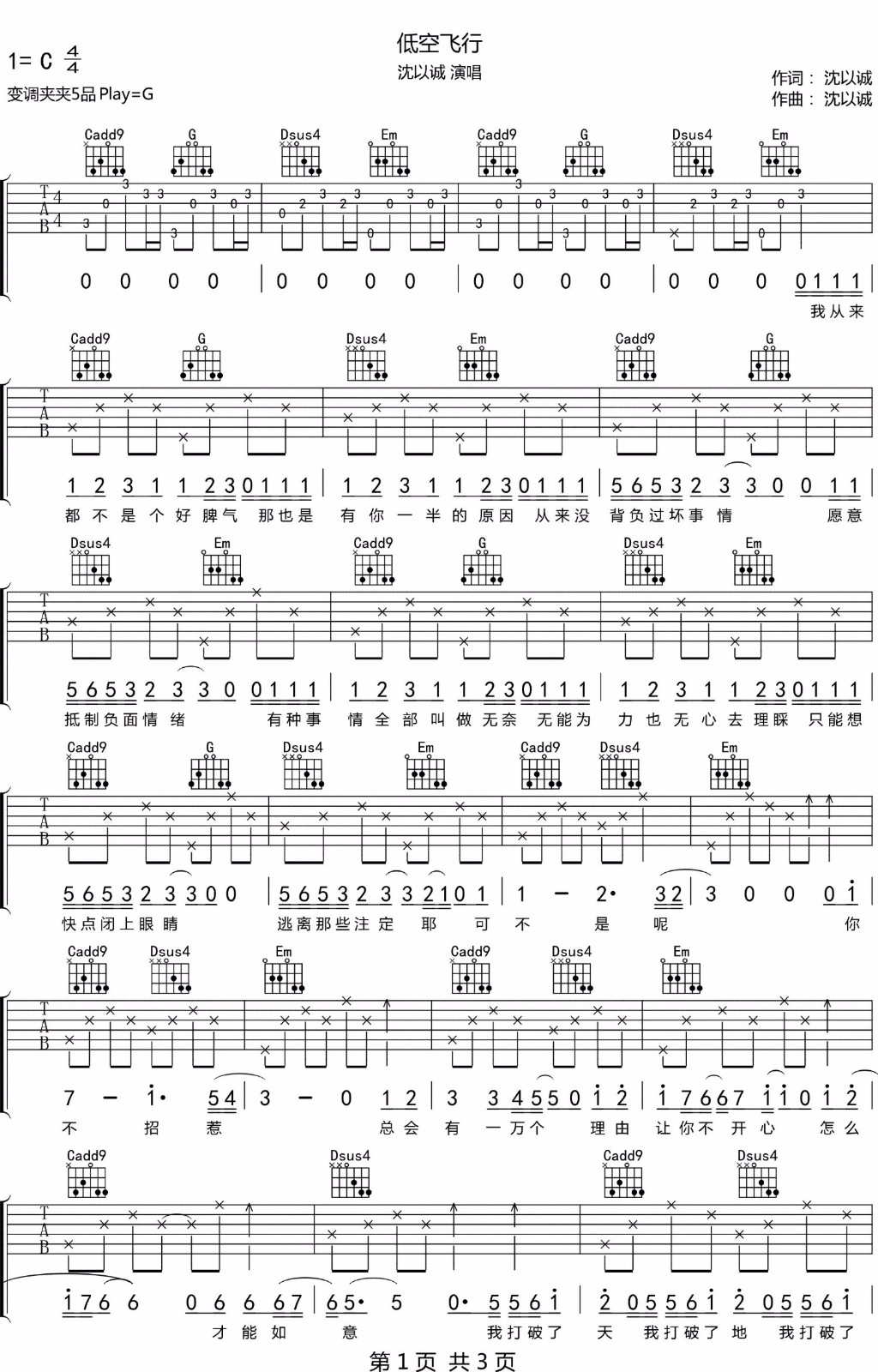 沈以诚《低空飞行吉他谱》(C调)