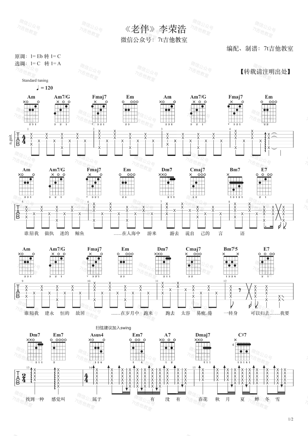 《李荣浩《老伴吉他谱》(C调)》内容来自于互联网,不能保证内容的准确性与完整性,仅供学习交流欣赏,请勿用于其它用途,内容版权归原作者及来源网站所有,如有侵犯到您的权益请来信告知,我们将及时删除。