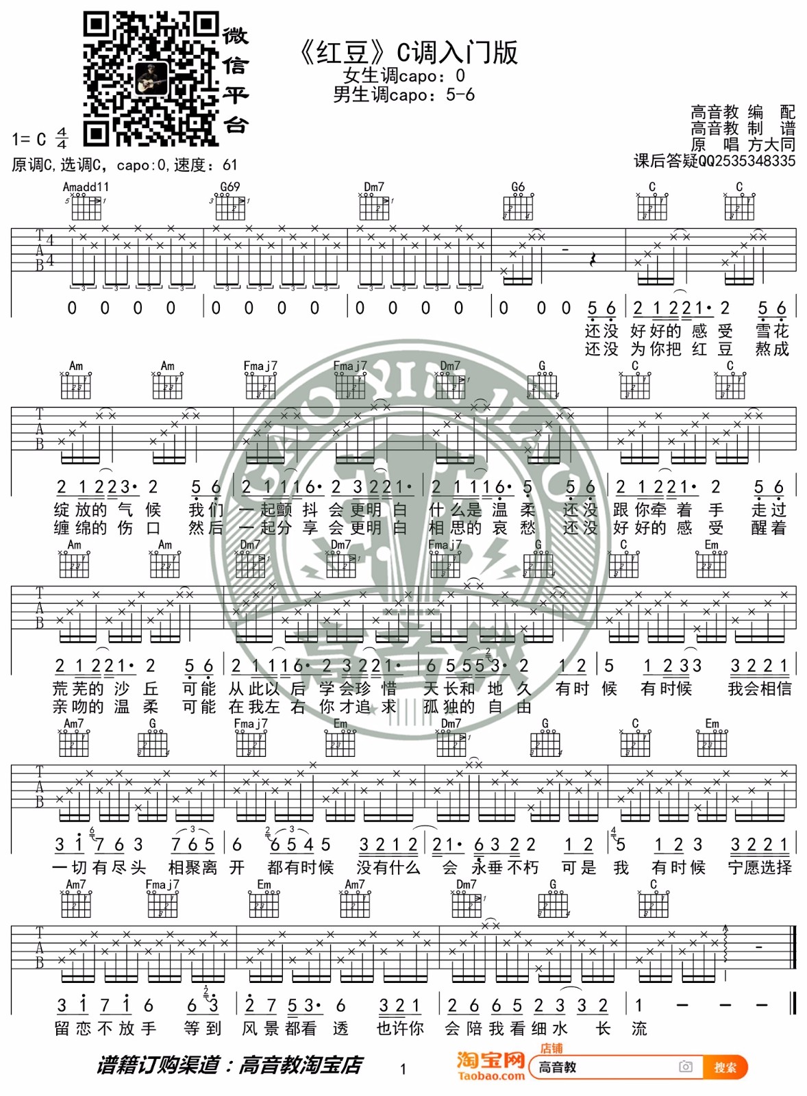 《方大同《红豆吉他谱》(C调)》内容来自于互联网,不能保证内容的准确性与完整性,仅供学习交流欣赏,请勿用于其它用途,内容版权归原作者及来源网站所有,如有侵犯到您的权益请来信告知,我们将及时删除。