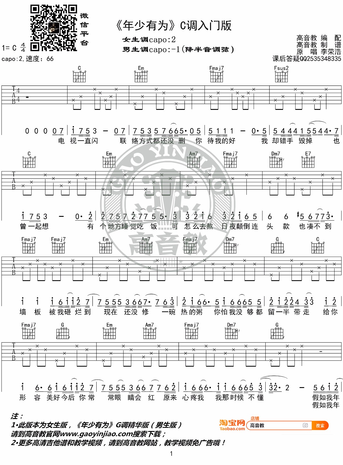 《李荣浩《年少有为吉他谱》(C调)》内容来自于互联网,不能保证内容的准确性与完整性,仅供学习交流欣赏,请勿用于其它用途,内容版权归原作者及来源网站所有,如有侵犯到您的权益请来信告知,我们将及时删除。