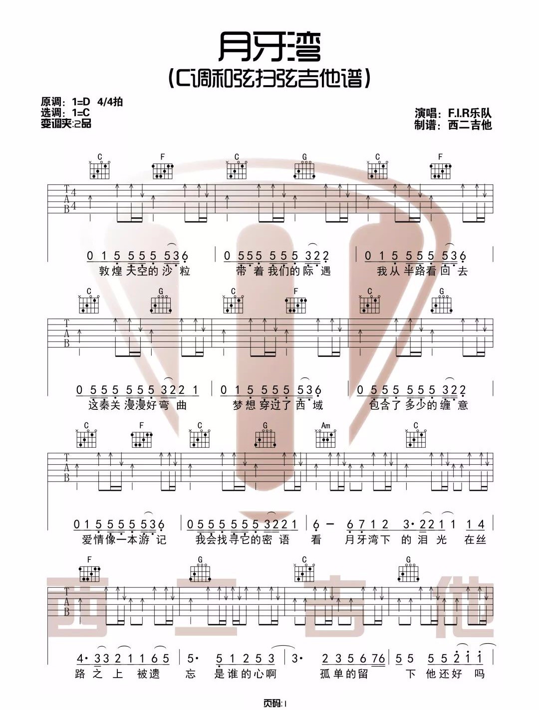《飞儿乐团《月牙湾吉他谱》(C调)》内容来自于互联网,不能保证内容的准确性与完整性,仅供学习交流欣赏,请勿用于其它用途,内容版权归原作者及来源网站所有,如有侵犯到您的权益请来信告知,我们将及时删除。