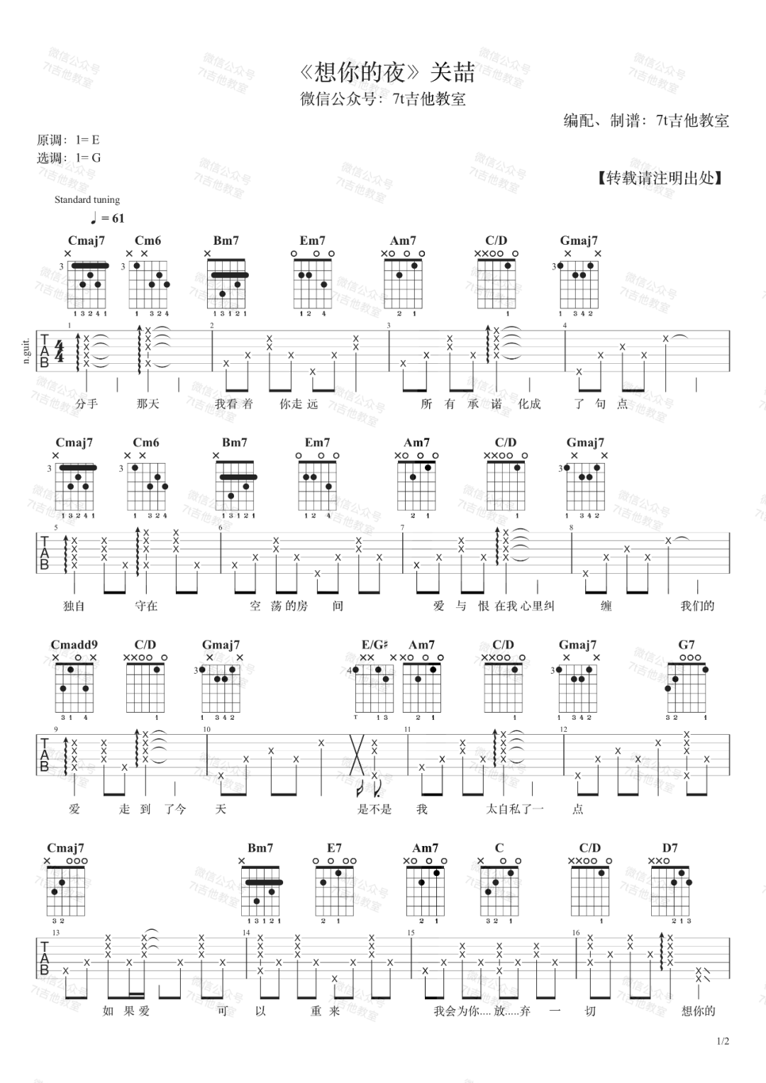 《关喆《想你的夜吉他谱》(A调)》内容来自于互联网,不能保证内容的准确性与完整性,仅供学习交流欣赏,请勿用于其它用途,内容版权归原作者及来源网站所有,如有侵犯到您的权益请来信告知,我们将及时删除。