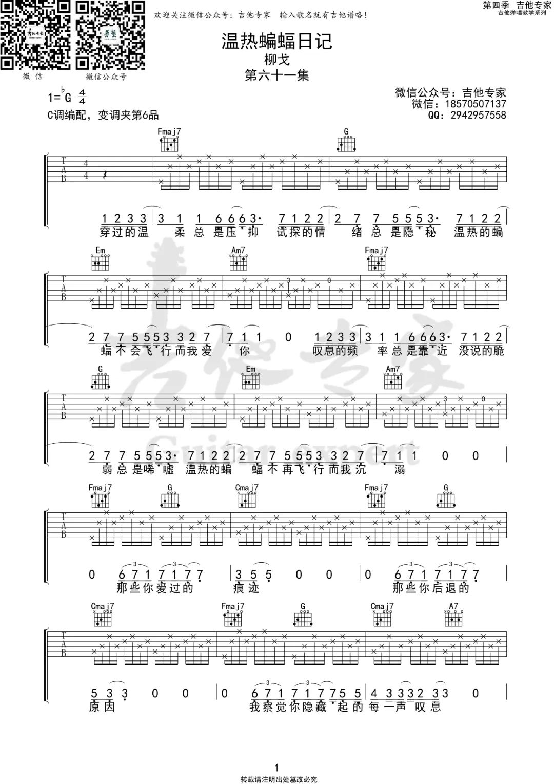 《柳戈《温热蝙蝠日记吉他谱》(G调)》内容来自于互联网,不能保证内容的准确性与完整性,仅供学习交流欣赏,请勿用于其它用途,内容版权归原作者及来源网站所有,如有侵犯到您的权益请来信告知,我们将及时删除。