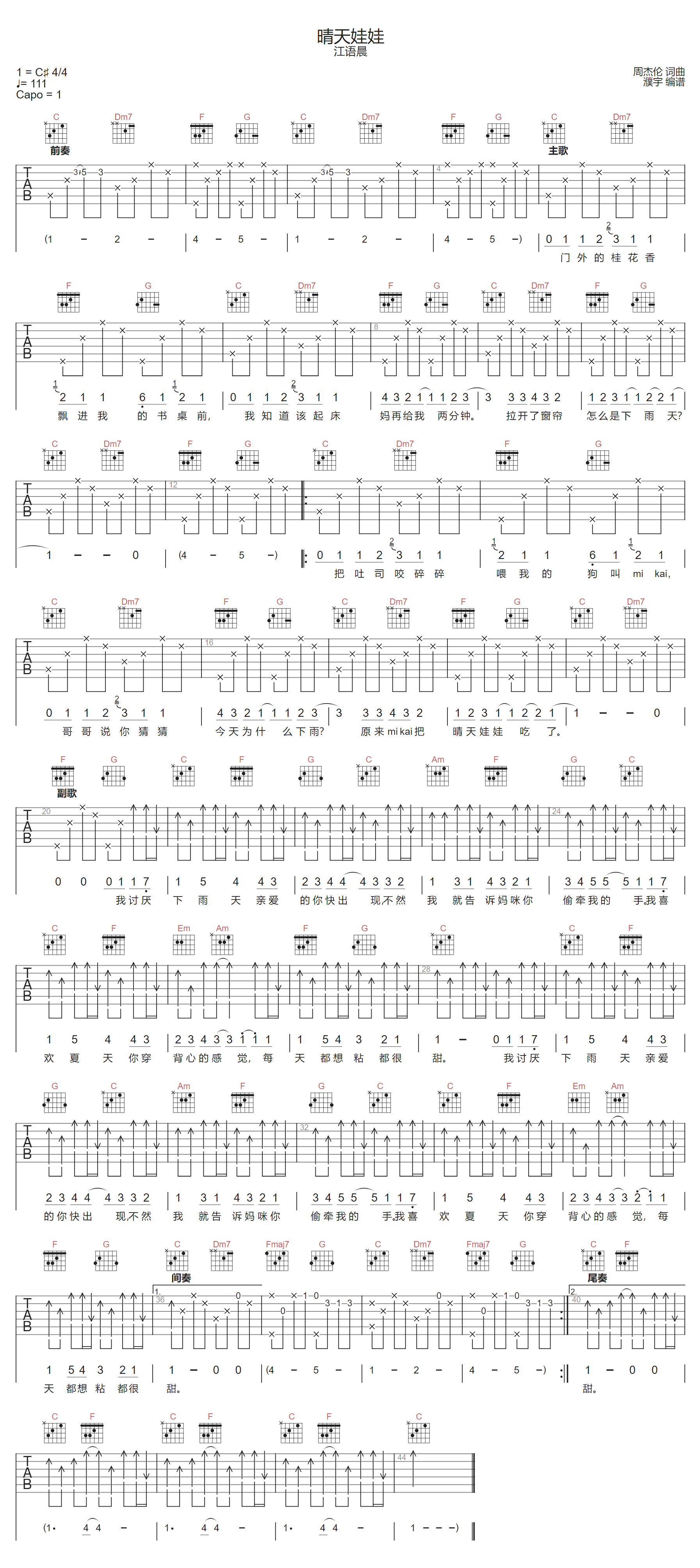 《江语晨《晴天娃娃吉他谱》(G调)》内容来自于互联网,不能保证内容的准确性与完整性,仅供学习交流欣赏,请勿用于其它用途,内容版权归原作者及来源网站所有,如有侵犯到您的权益请来信告知,我们将及时删除。