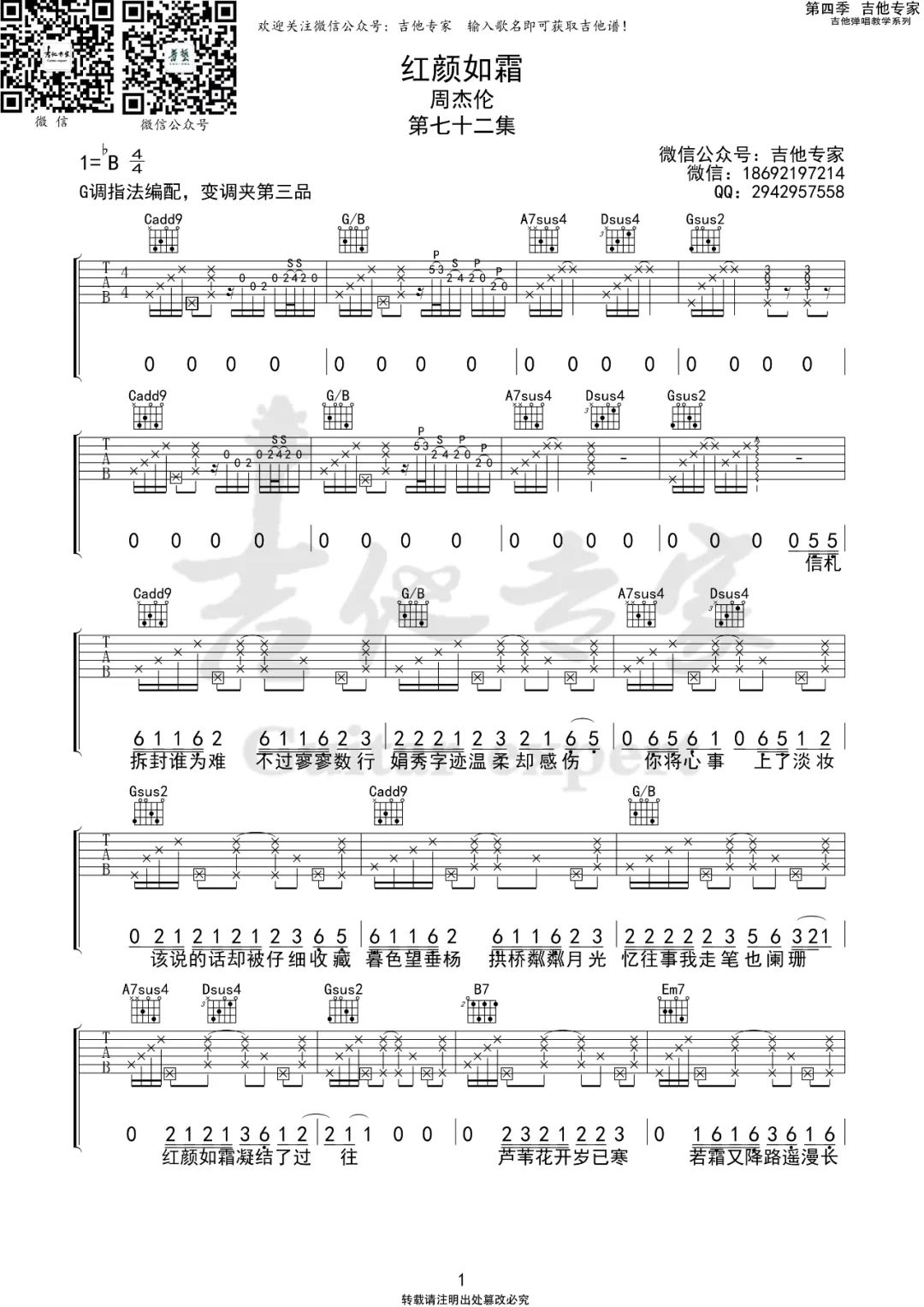 《周杰伦《红颜如霜吉他谱》(G调)》内容来自于互联网,不能保证内容的准确性与完整性,仅供学习交流欣赏,请勿用于其它用途,内容版权归原作者及来源网站所有,如有侵犯到您的权益请来信告知,我们将及时删除。
