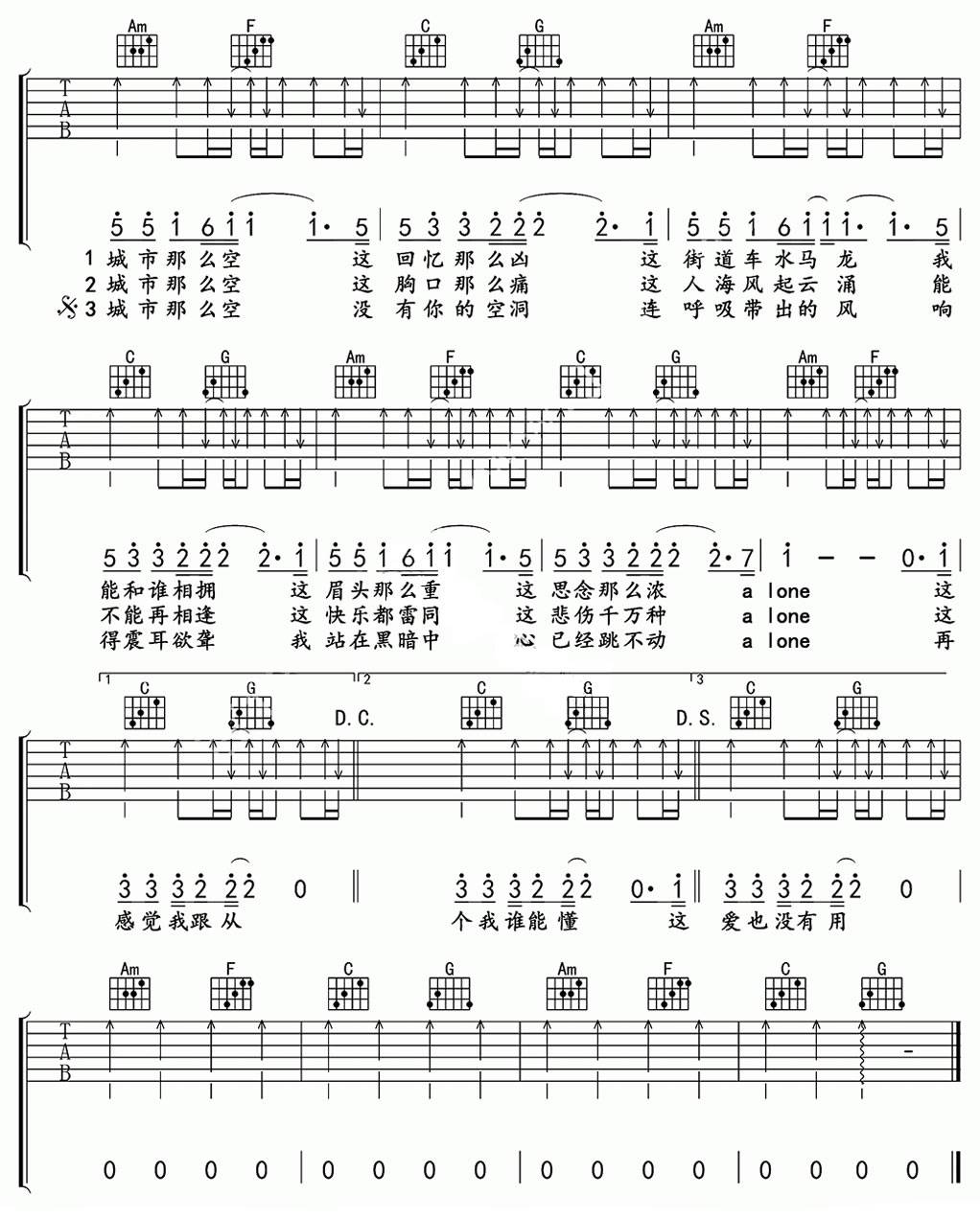 《杨坤/金志文《空城吉他谱》(C调)》内容来自于互联网,不能保证内容的准确性与完整性,仅供学习交流欣赏,请勿用于其它用途,内容版权归原作者及来源网站所有,如有侵犯到您的权益请来信告知,我们将及时删除。