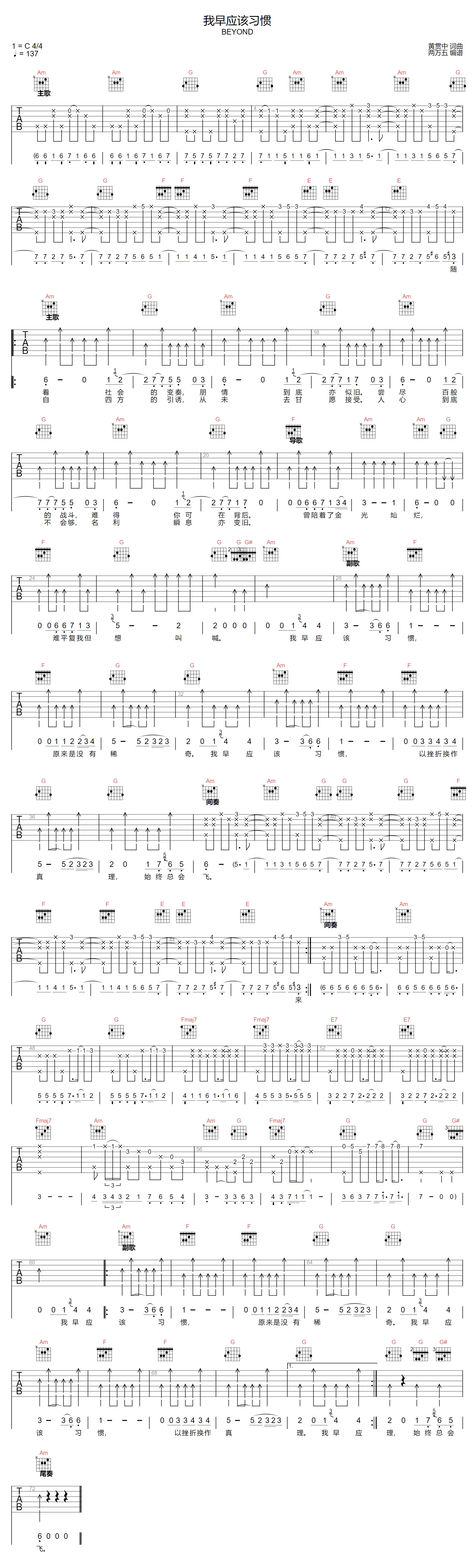 《Beyond《我早应该习惯吉他谱》(C调)》内容来自于互联网,不能保证内容的准确性与完整性,仅供学习交流欣赏,请勿用于其它用途,内容版权归原作者及来源网站所有,如有侵犯到您的权益请来信告知,我们将及时删除。