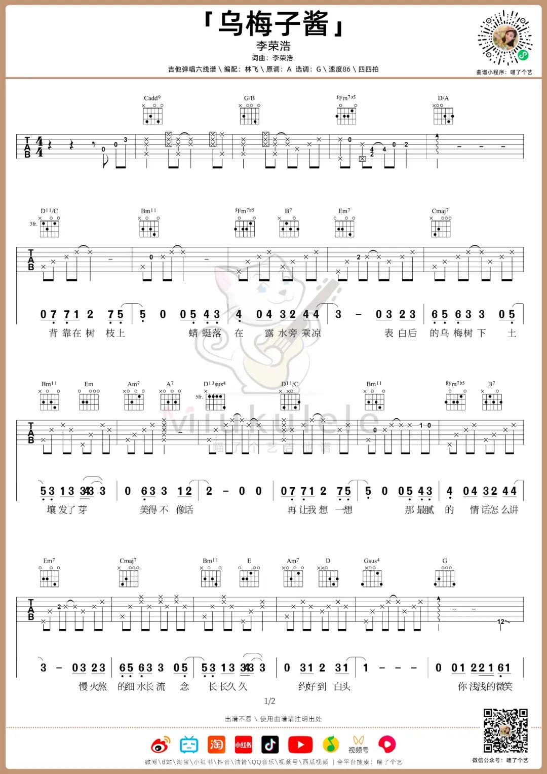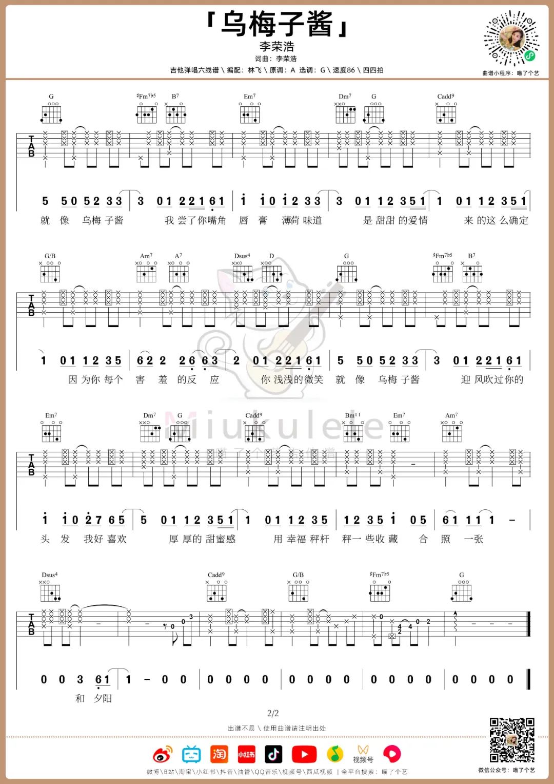 《李荣浩《乌梅子酱吉他谱》(C调)》内容来自于互联网,不能保证内容的准确性与完整性,仅供学习交流欣赏,请勿用于其它用途,内容版权归原作者及来源网站所有,如有侵犯到您的权益请来信告知,我们将及时删除。