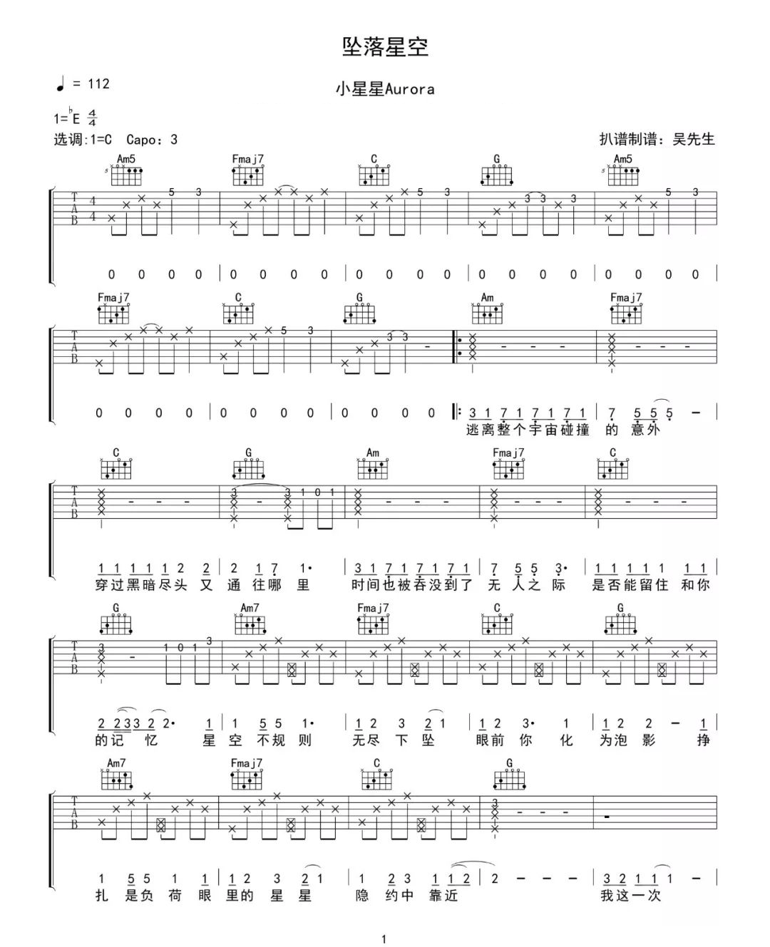 《小星星Aurora《坠落星空吉他谱》(G调)》内容来自于互联网,不能保证内容的准确性与完整性,仅供学习交流欣赏,请勿用于其它用途,内容版权归原作者及来源网站所有,如有侵犯到您的权益请来信告知,我们将及时删除。