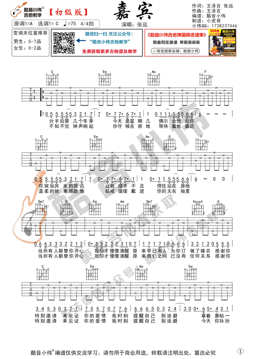 《张远《嘉宾吉他谱》(G调)》内容来自于互联网,不能保证内容的准确性与完整性,仅供学习交流欣赏,请勿用于其它用途,内容版权归原作者及来源网站所有,如有侵犯到您的权益请来信告知,我们将及时删除。