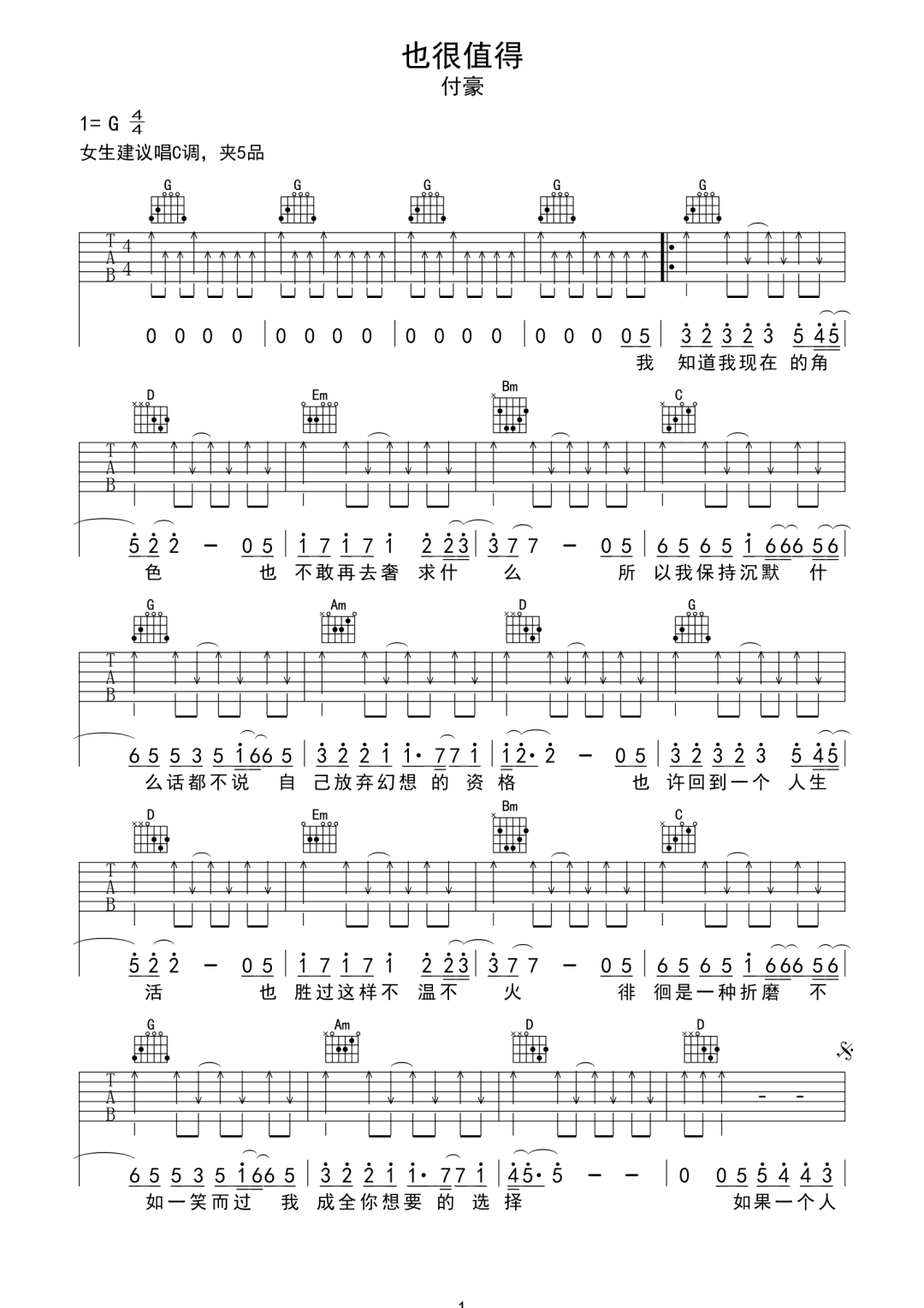 《付豪《也很值得吉他谱》(D调)》内容来自于互联网,不能保证内容的准确性与完整性,仅供学习交流欣赏,请勿用于其它用途,内容版权归原作者及来源网站所有,如有侵犯到您的权益请来信告知,我们将及时删除。