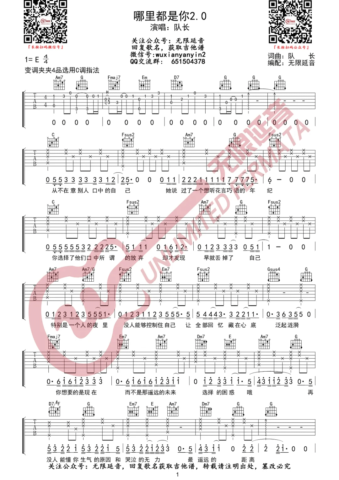 《队长《哪里都是你2.0吉他谱》(C调)》内容来自于互联网,不能保证内容的准确性与完整性,仅供学习交流欣赏,请勿用于其它用途,内容版权归原作者及来源网站所有,如有侵犯到您的权益请来信告知,我们将及时删除。