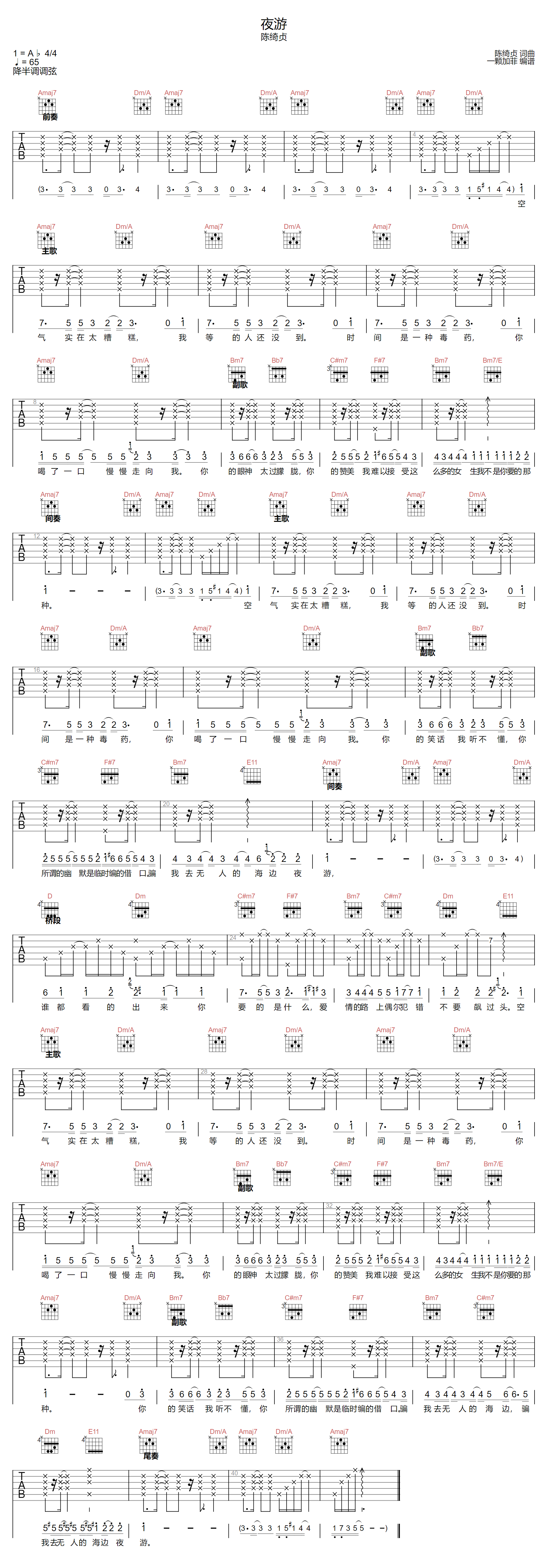 《陈绮贞《夜游吉他谱》(C调)》内容来自于互联网,不能保证内容的准确性与完整性,仅供学习交流欣赏,请勿用于其它用途,内容版权归原作者及来源网站所有,如有侵犯到您的权益请来信告知,我们将及时删除。