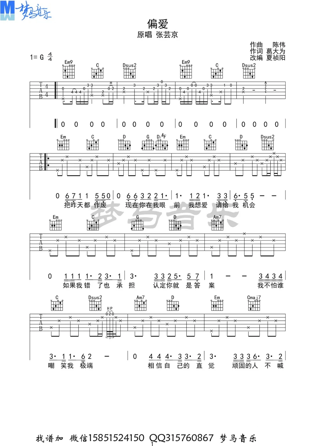 《张芸京《偏爱吉他谱》(C调)》内容来自于互联网,不能保证内容的准确性与完整性,仅供学习交流欣赏,请勿用于其它用途,内容版权归原作者及来源网站所有,如有侵犯到您的权益请来信告知,我们将及时删除。