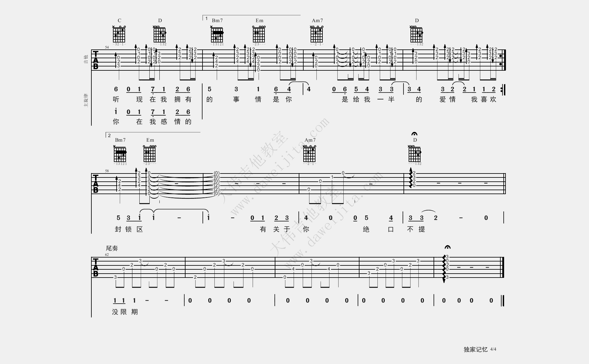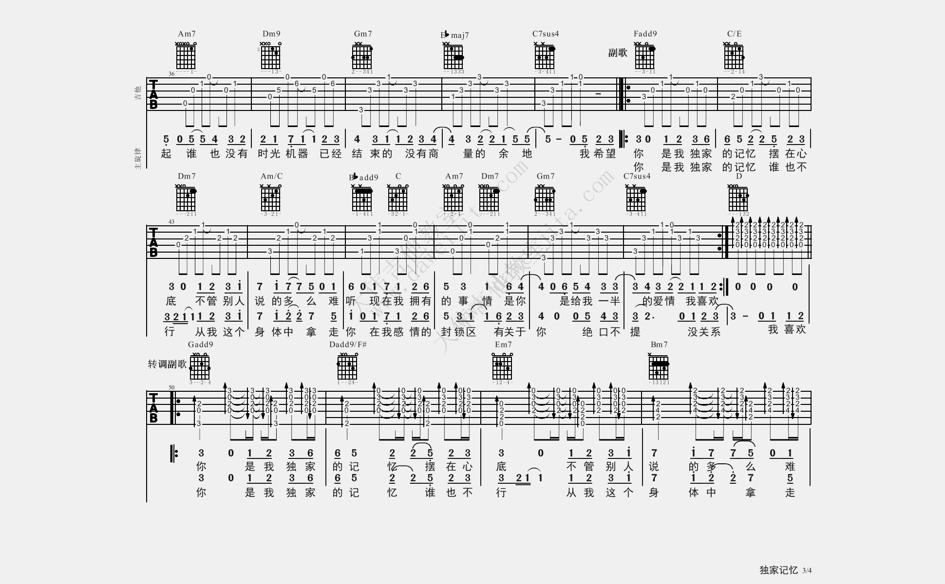 《陈小春《独家记忆吉他谱》(C调)》内容来自于互联网,不能保证内容的准确性与完整性,仅供学习交流欣赏,请勿用于其它用途,内容版权归原作者及来源网站所有,如有侵犯到您的权益请来信告知,我们将及时删除。