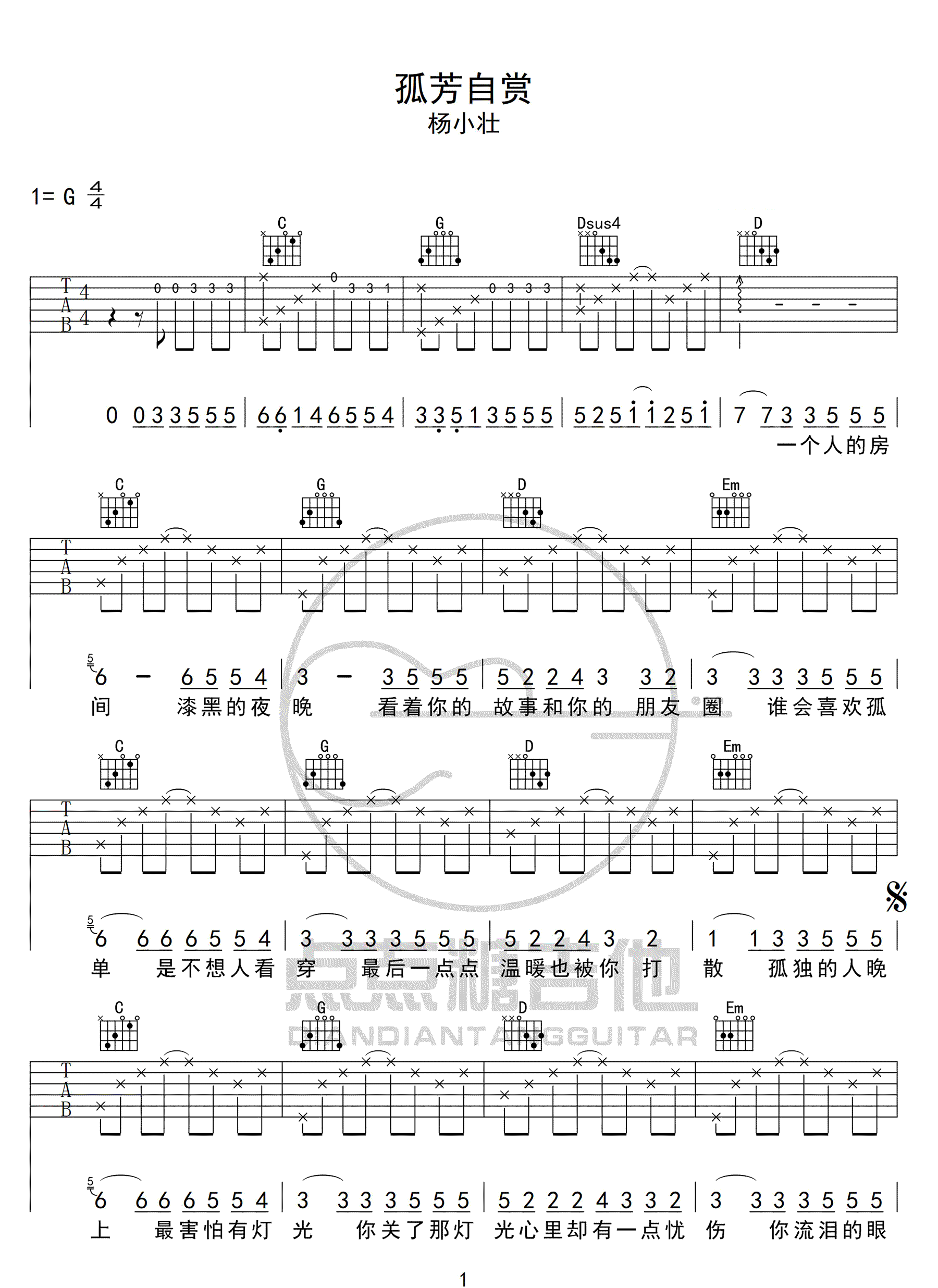 《杨小壮《孤芳自赏吉他谱》(C调)》内容来自于互联网,不能保证内容的准确性与完整性,仅供学习交流欣赏,请勿用于其它用途,内容版权归原作者及来源网站所有,如有侵犯到您的权益请来信告知,我们将及时删除。