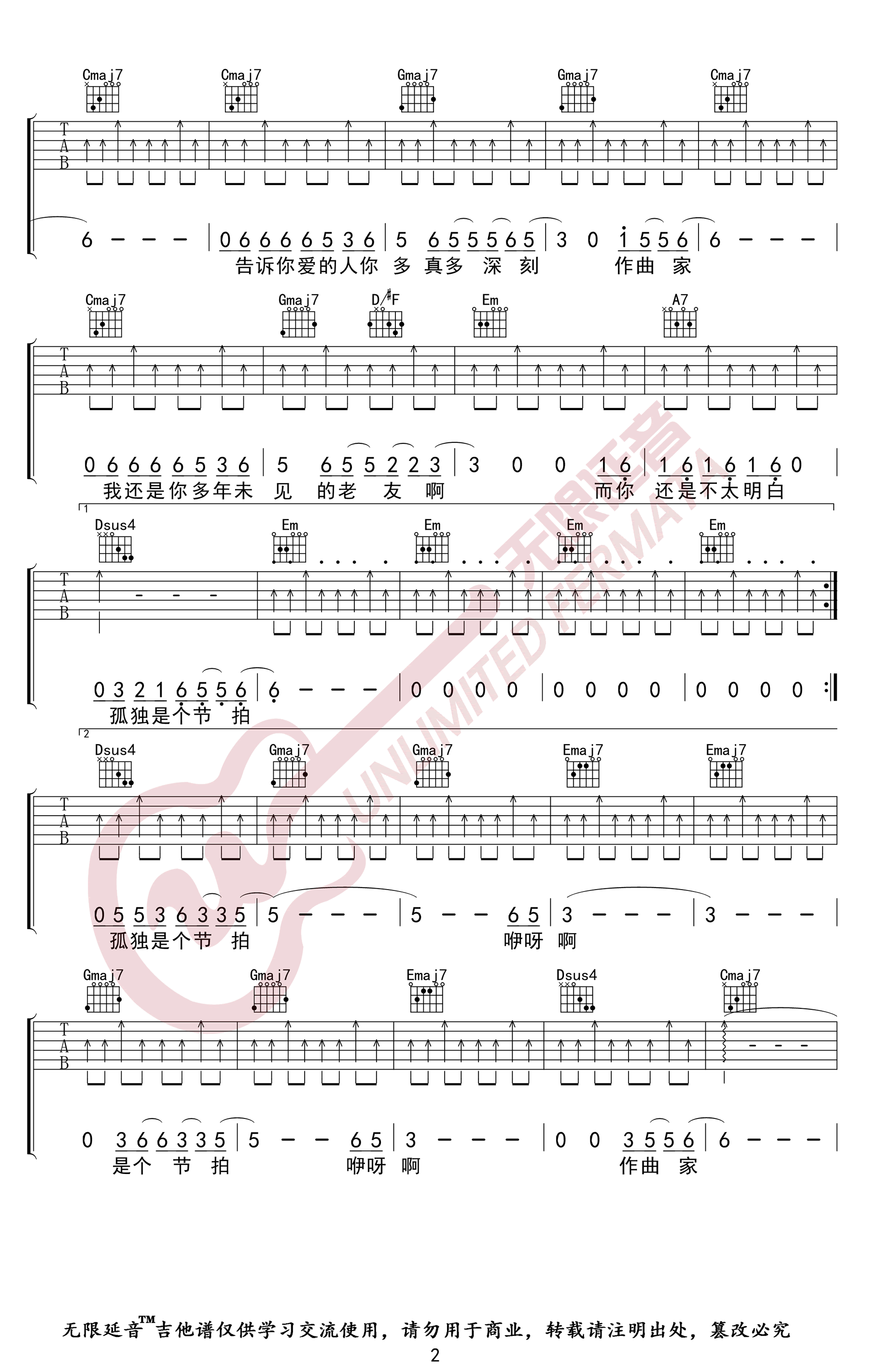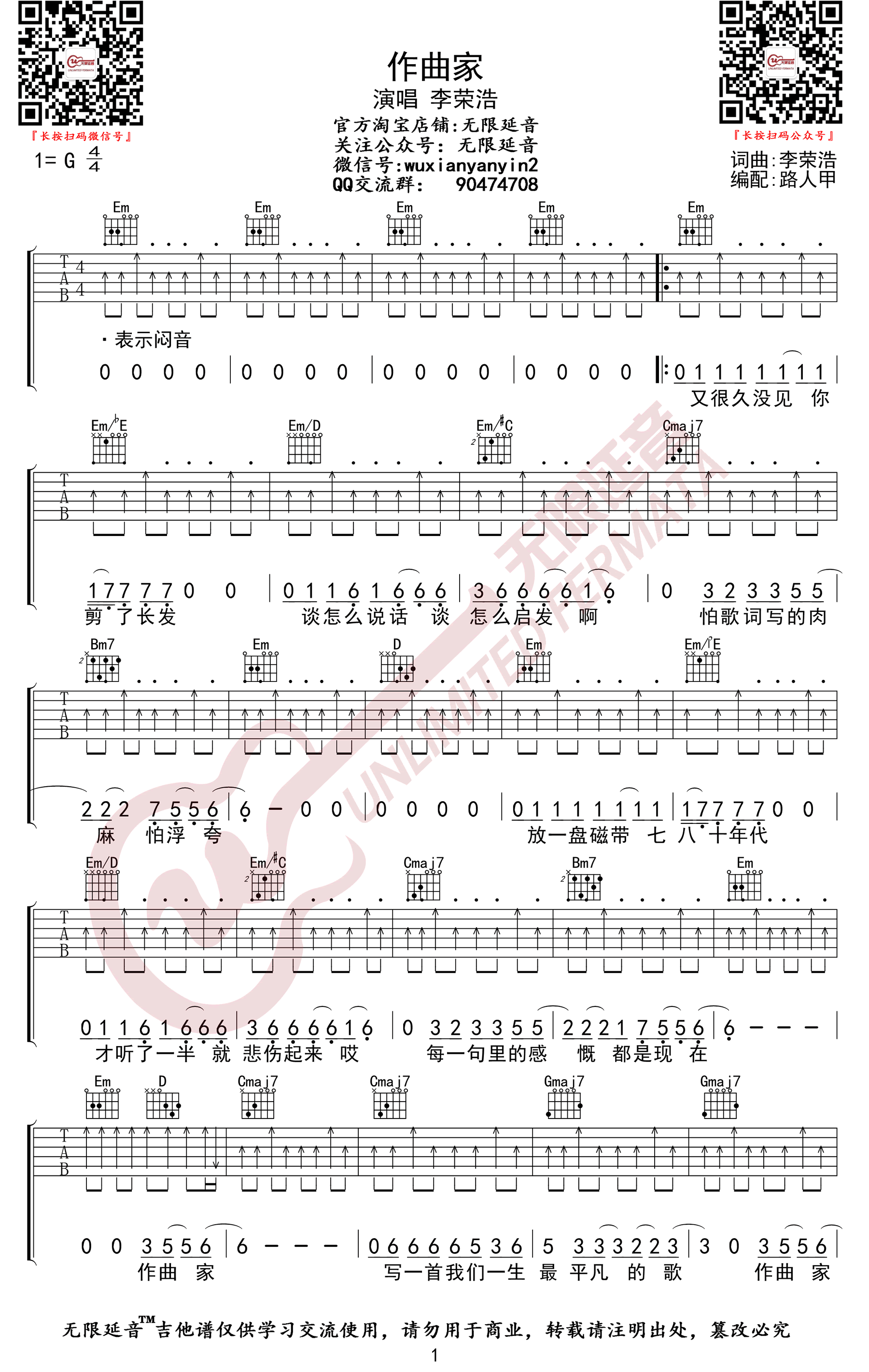《李荣浩《作曲家吉他谱》(G调)》内容来自于互联网,不能保证内容的准确性与完整性,仅供学习交流欣赏,请勿用于其它用途,内容版权归原作者及来源网站所有,如有侵犯到您的权益请来信告知,我们将及时删除。
