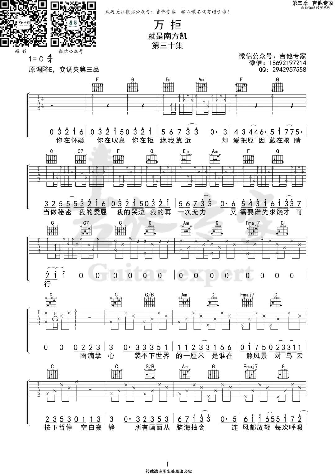 就是南方凯《万拒吉他谱》(G调)