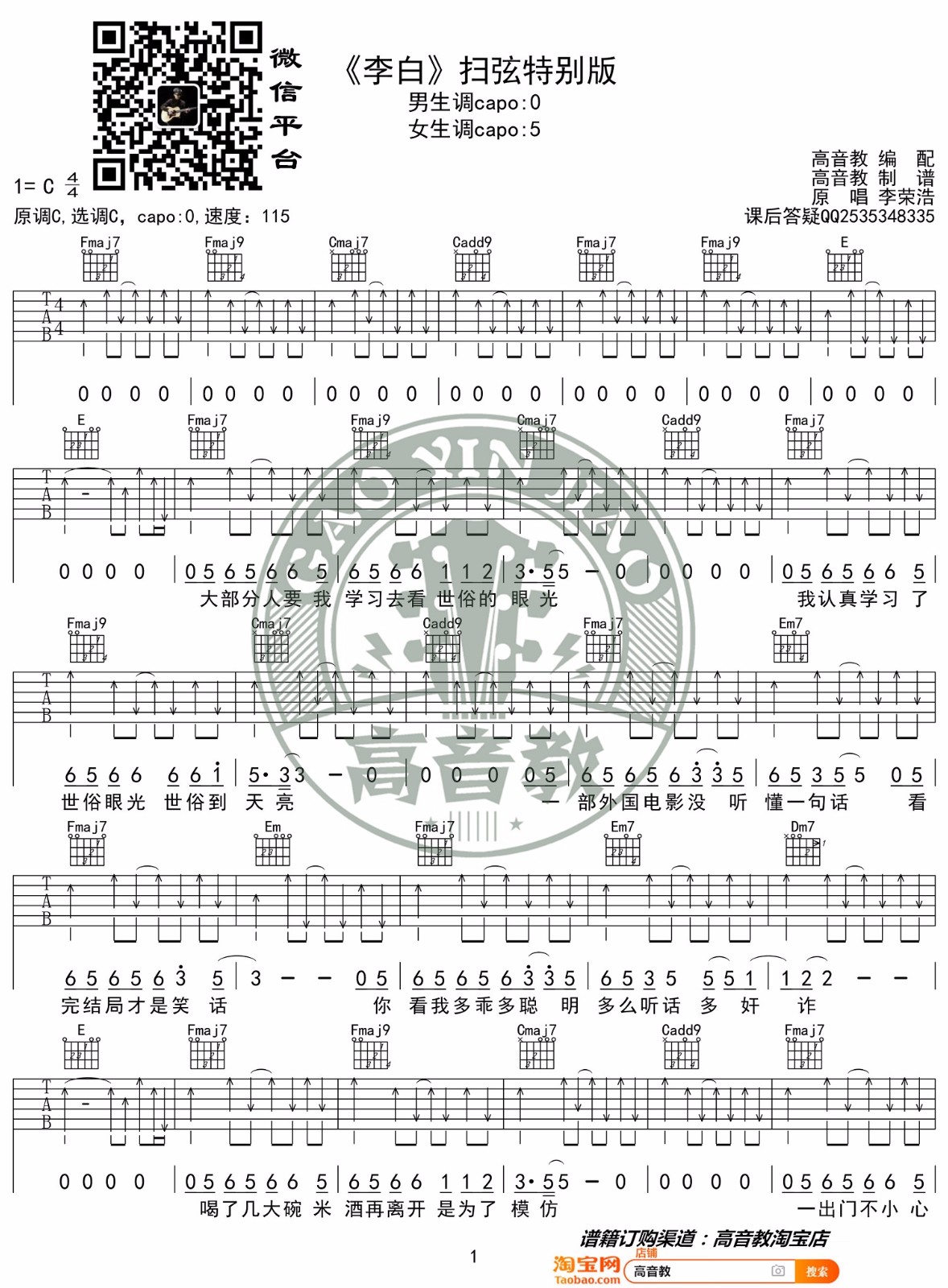 《李荣浩《李白吉他谱》(E调)》内容来自于互联网,不能保证内容的准确性与完整性,仅供学习交流欣赏,请勿用于其它用途,内容版权归原作者及来源网站所有,如有侵犯到您的权益请来信告知,我们将及时删除。