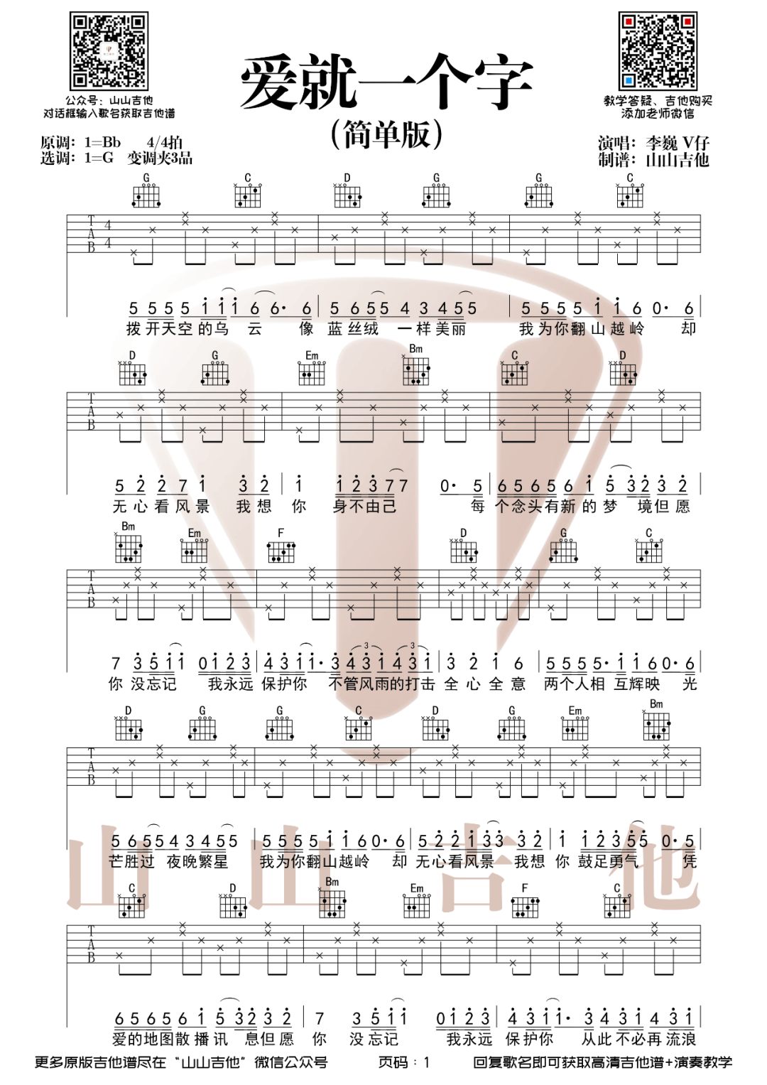 《李巍V仔《爱就一个字吉他谱》(C调)》内容来自于互联网,不能保证内容的准确性与完整性,仅供学习交流欣赏,请勿用于其它用途,内容版权归原作者及来源网站所有,如有侵犯到您的权益请来信告知,我们将及时删除。