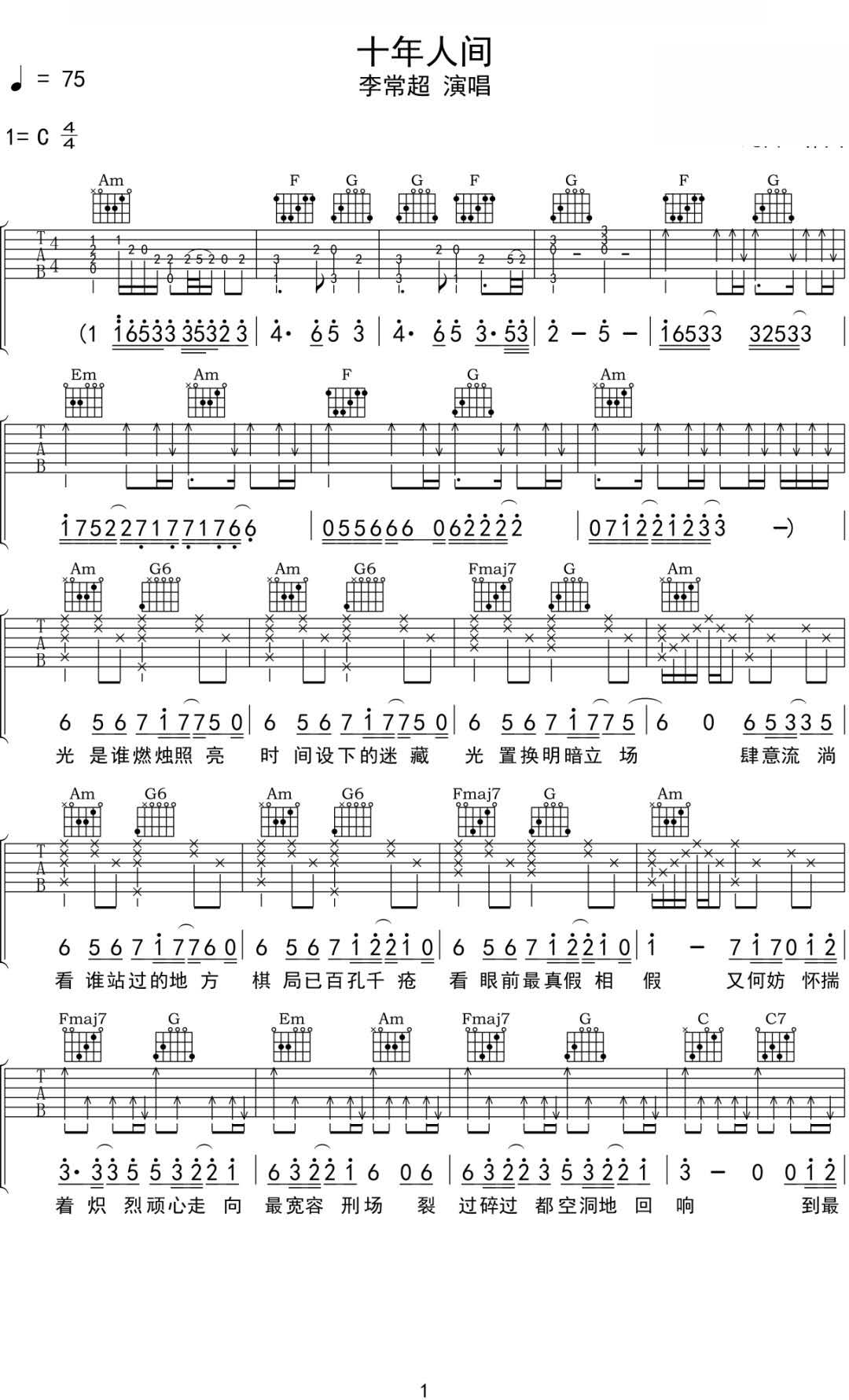 《李常超《十年人间吉他谱》(G调)》内容来自于互联网,不能保证内容的准确性与完整性,仅供学习交流欣赏,请勿用于其它用途,内容版权归原作者及来源网站所有,如有侵犯到您的权益请来信告知,我们将及时删除。