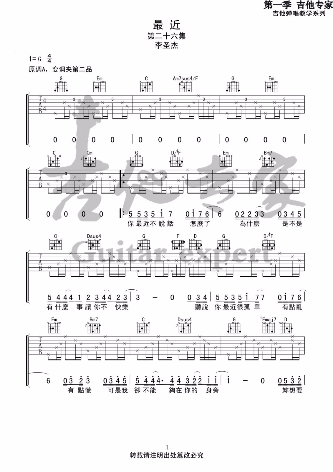 《李圣杰《最近吉他谱》(C调)》内容来自于互联网,不能保证内容的准确性与完整性,仅供学习交流欣赏,请勿用于其它用途,内容版权归原作者及来源网站所有,如有侵犯到您的权益请来信告知,我们将及时删除。