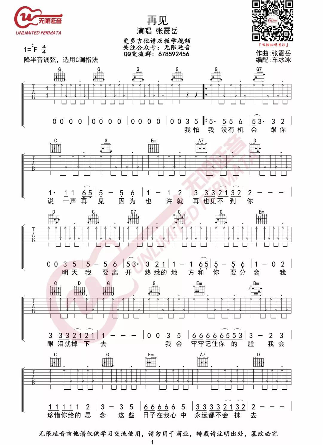 《张震岳《再见吉他谱》(G调)》内容来自于互联网,不能保证内容的准确性与完整性,仅供学习交流欣赏,请勿用于其它用途,内容版权归原作者及来源网站所有,如有侵犯到您的权益请来信告知,我们将及时删除。