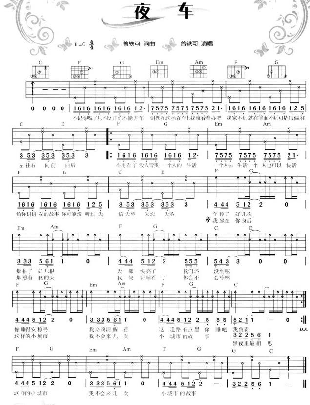 《曾轶可《夜车吉他谱》(G调)》内容来自于互联网,不能保证内容的准确性与完整性,仅供学习交流欣赏,请勿用于其它用途,内容版权归原作者及来源网站所有,如有侵犯到您的权益请来信告知,我们将及时删除。
