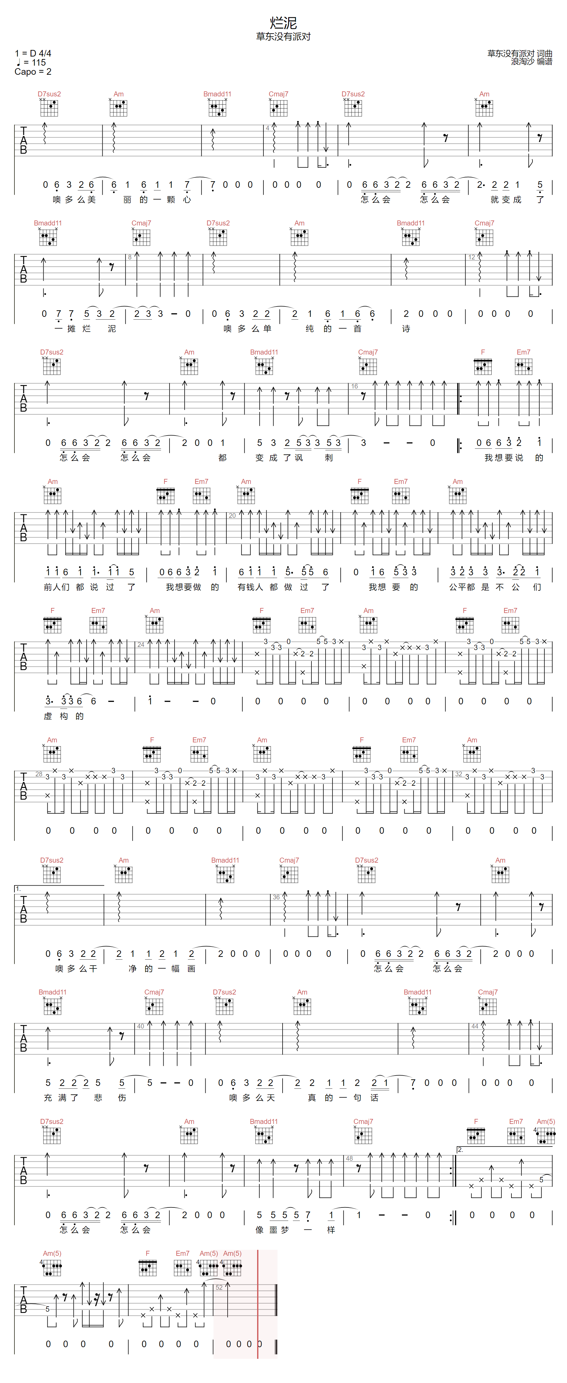 《烂泥》由草东没有派对创作并演唱,以G调谱写,收录于2009年专辑。歌曲通过激昂的旋律与重复的吉他节奏,表达青年内心的挣扎与情感宣泄。弹奏时运用强力和弦与扫弦技巧,突出力量感与节奏层次。整体风格直率而充满张力,融合摇滚与情绪化元素,传递出年轻一代的迷茫与呐喊。