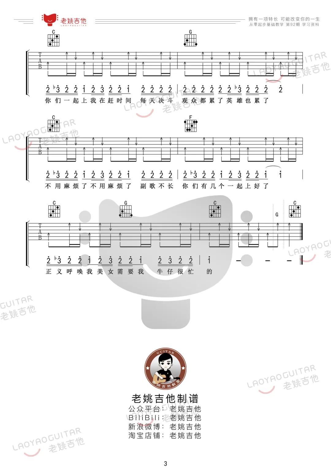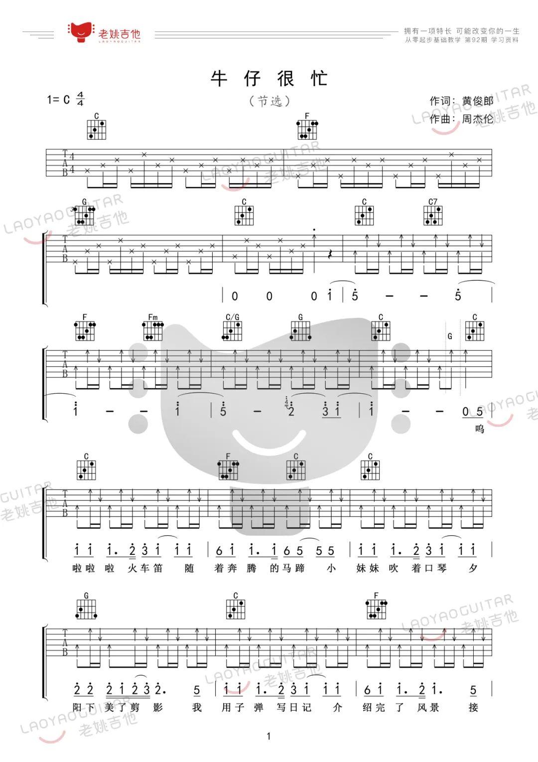 《周杰伦《牛仔很忙吉他谱》(G调)》内容来自于互联网,不能保证内容的准确性与完整性,仅供学习交流欣赏,请勿用于其它用途,内容版权归原作者及来源网站所有,如有侵犯到您的权益请来信告知,我们将及时删除。