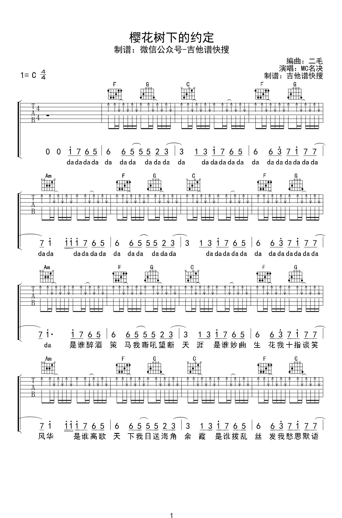 《MC名决《樱花树下的约定吉他谱》(C调)》内容来自于互联网,不能保证内容的准确性与完整性,仅供学习交流欣赏,请勿用于其它用途,内容版权归原作者及来源网站所有,如有侵犯到您的权益请来信告知,我们将及时删除。