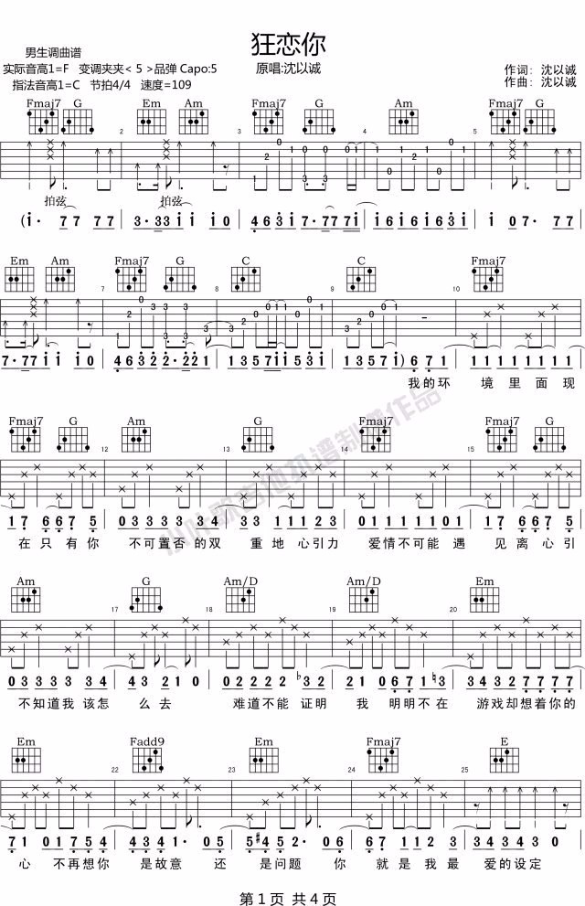 《沈以诚《狂恋你吉他谱》(C调)》内容来自于互联网,不能保证内容的准确性与完整性,仅供学习交流欣赏,请勿用于其它用途,内容版权归原作者及来源网站所有,如有侵犯到您的权益请来信告知,我们将及时删除。