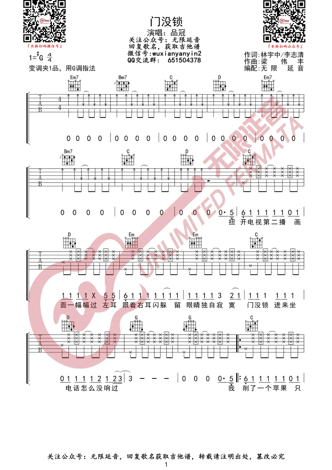 《品冠《门没锁吉他谱》(B调)》内容来自于互联网,不能保证内容的准确性与完整性,仅供学习交流欣赏,请勿用于其它用途,内容版权归原作者及来源网站所有,如有侵犯到您的权益请来信告知,我们将及时删除。