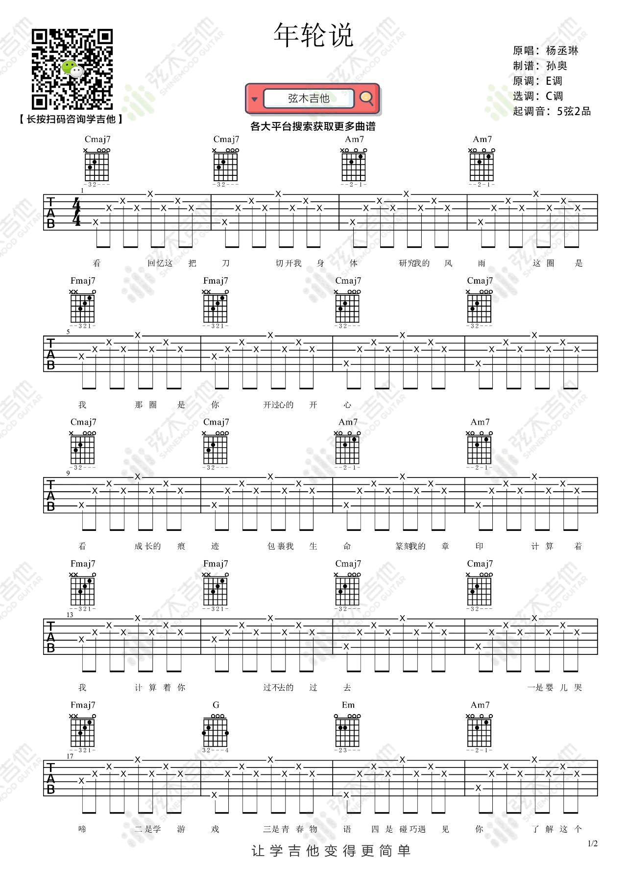 《杨丞琳《年轮说吉他谱》(C调)》内容来自于互联网,不能保证内容的准确性与完整性,仅供学习交流欣赏,请勿用于其它用途,内容版权归原作者及来源网站所有,如有侵犯到您的权益请来信告知,我们将及时删除。