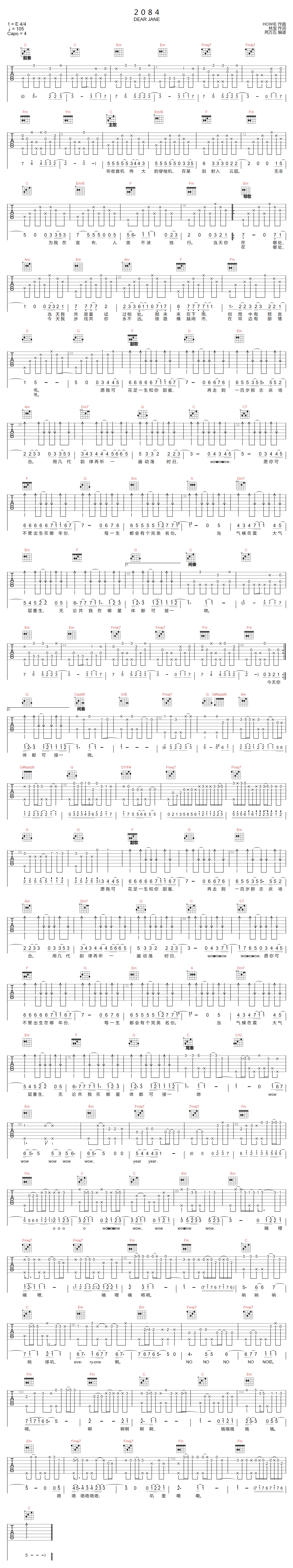 《Dear Jane《2084吉他谱》(C调)》内容来自于互联网,不能保证内容的准确性与完整性,仅供学习交流欣赏,请勿用于其它用途,内容版权归原作者及来源网站所有,如有侵犯到您的权益请来信告知,我们将及时删除。