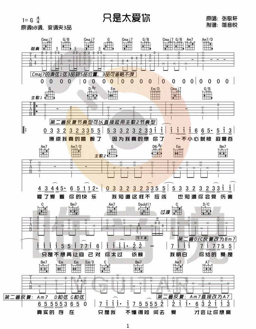 《张敬轩《只是太爱你吉他谱》(G调)》内容来自于互联网,不能保证内容的准确性与完整性,仅供学习交流欣赏,请勿用于其它用途,内容版权归原作者及来源网站所有,如有侵犯到您的权益请来信告知,我们将及时删除。