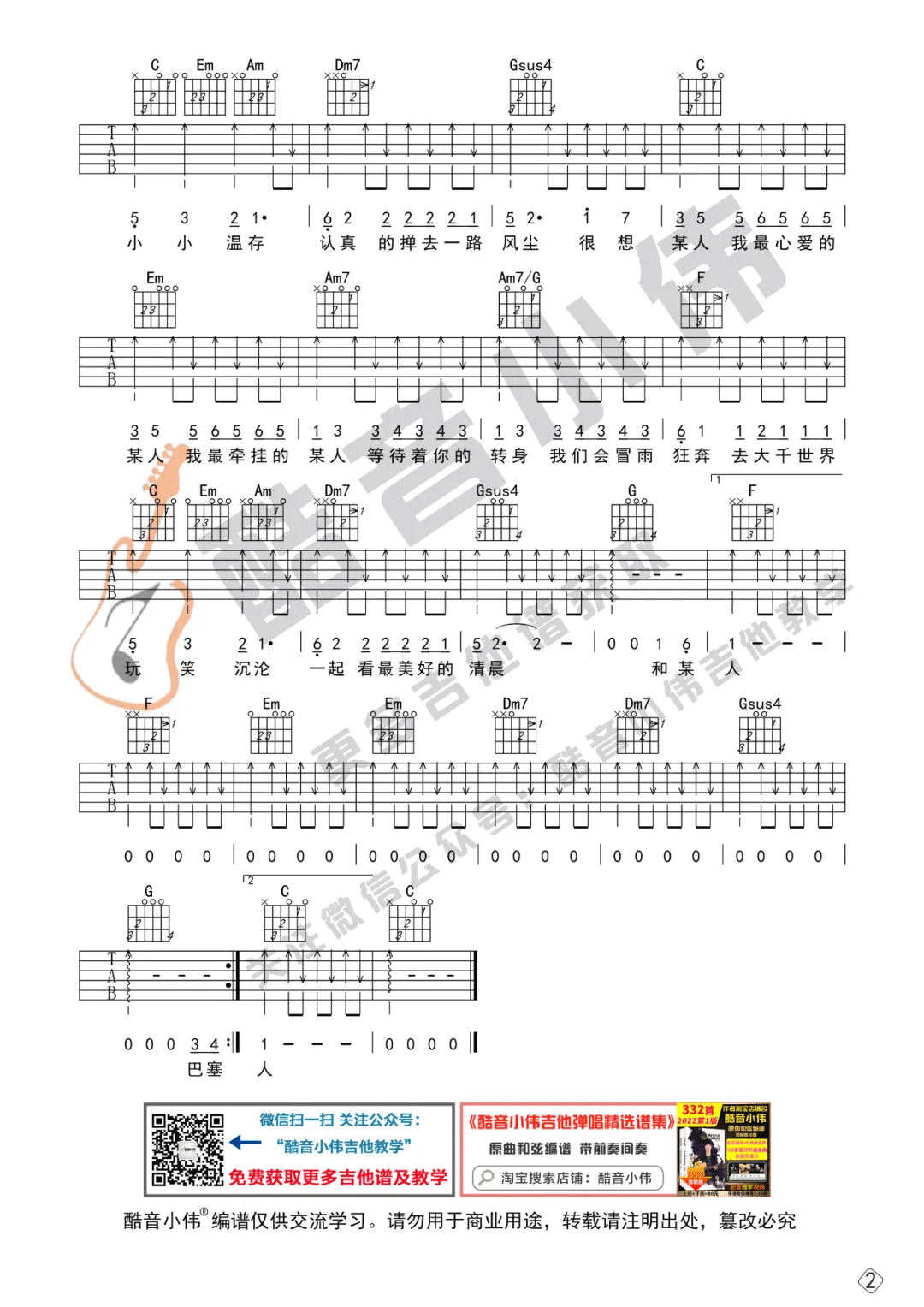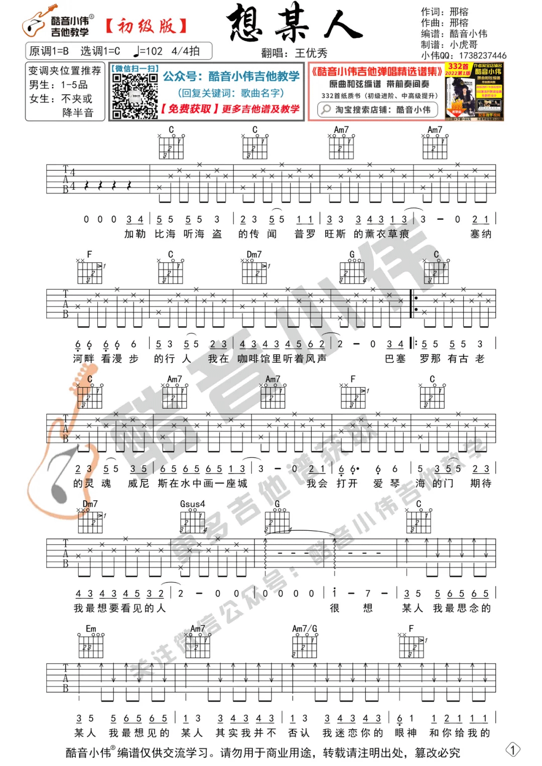 《王优秀《想某人吉他谱》(G调)》内容来自于互联网,不能保证内容的准确性与完整性,仅供学习交流欣赏,请勿用于其它用途,内容版权归原作者及来源网站所有,如有侵犯到您的权益请来信告知,我们将及时删除。