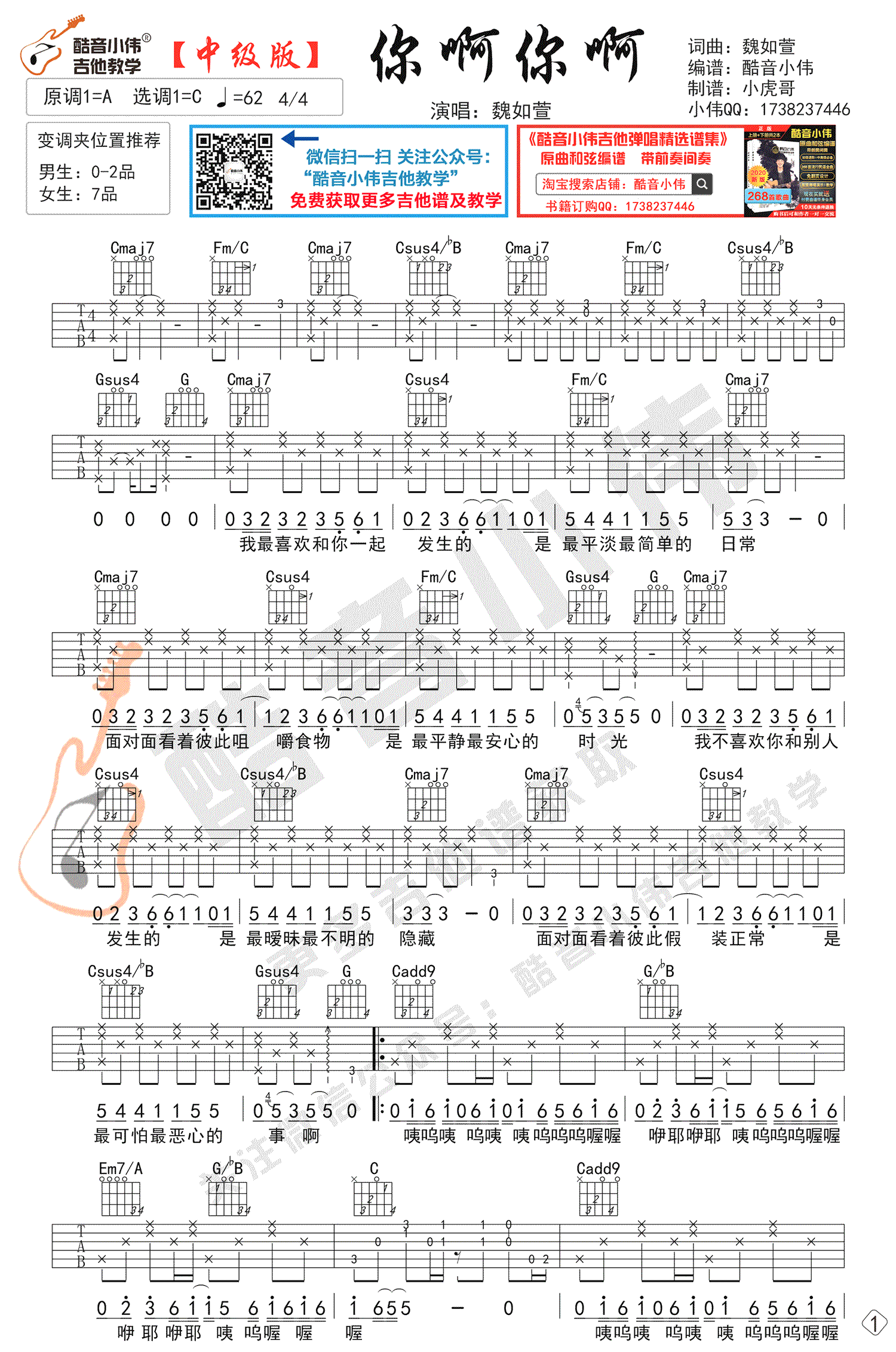 《魏如萱《你啊你啊吉他谱》(C调)》内容来自于互联网,不能保证内容的准确性与完整性,仅供学习交流欣赏,请勿用于其它用途,内容版权归原作者及来源网站所有,如有侵犯到您的权益请来信告知,我们将及时删除。