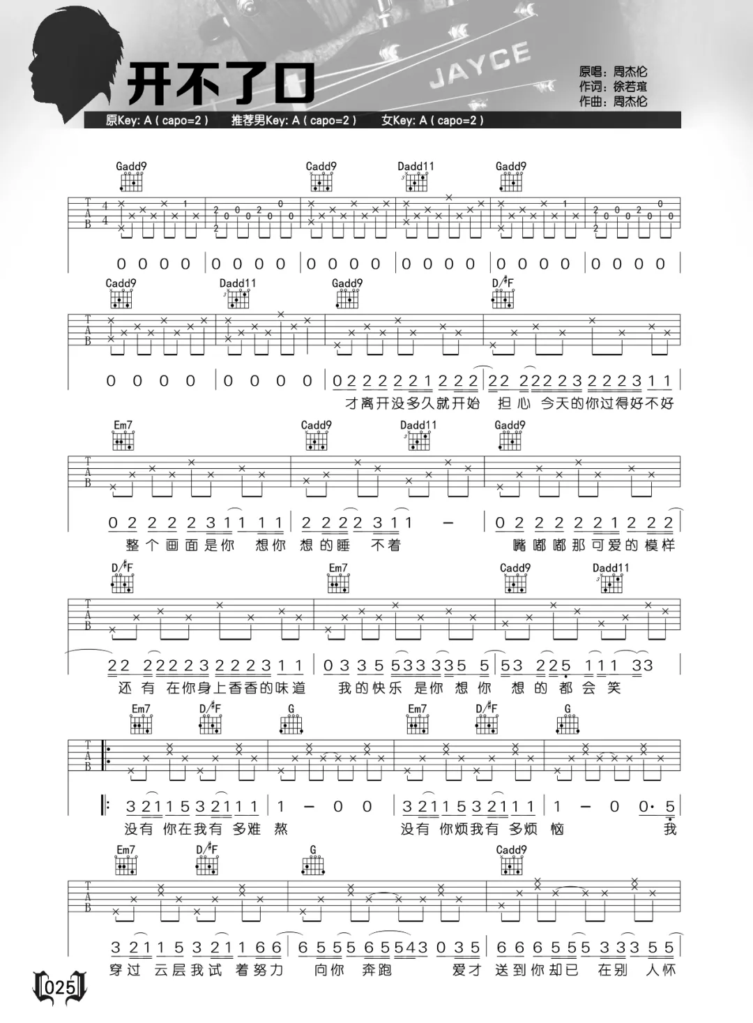 开不了口周杰伦演唱G调,这首歌是周杰伦的经典代表作,这首歌也是许多80、90的歌目,最近这首歌在网络上特别的火,轻快的旋律,让人欲罢不能,久听不腻。这里是周杰伦的翻唱版本,两张高清图片。