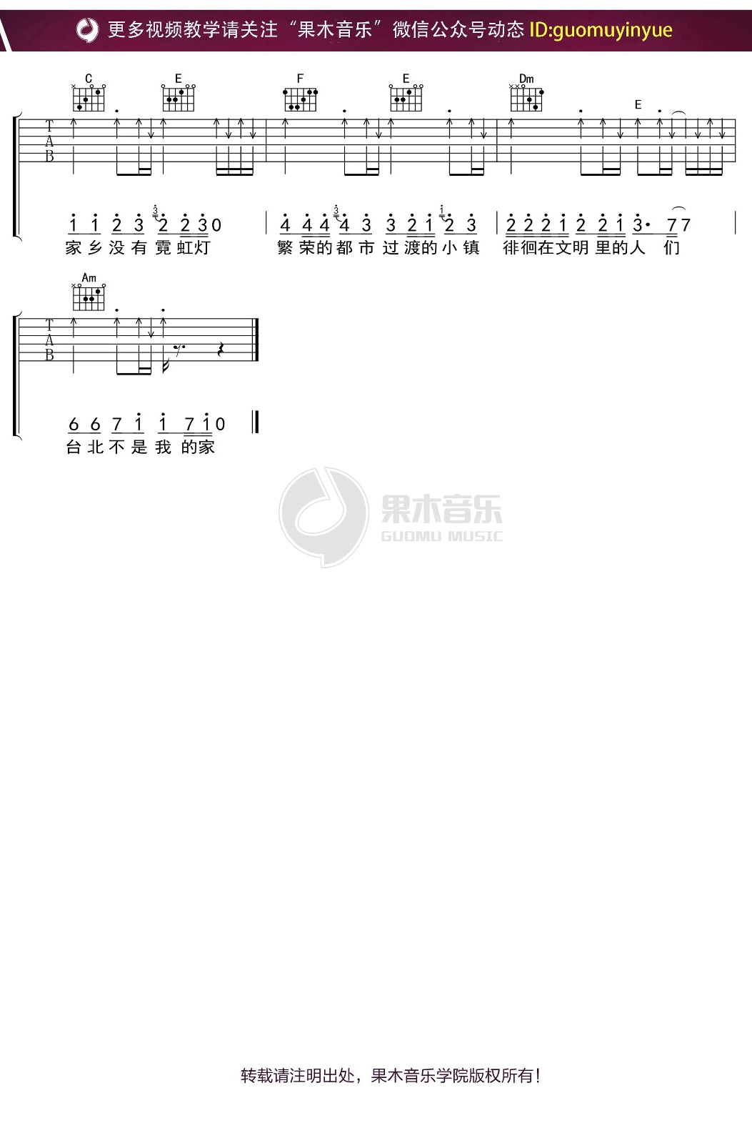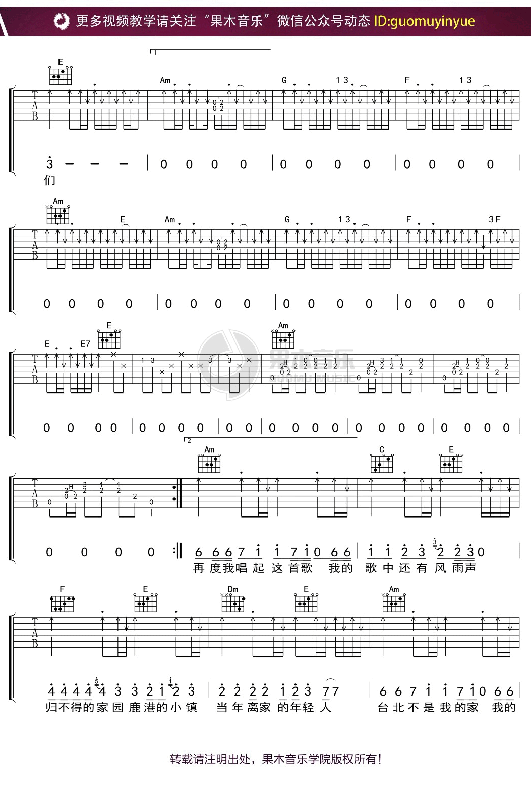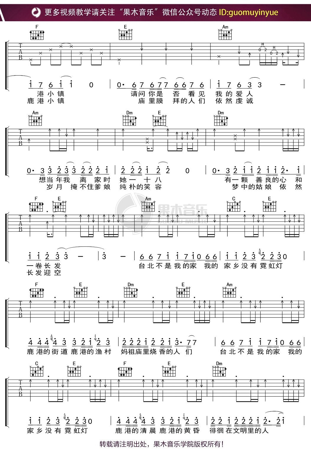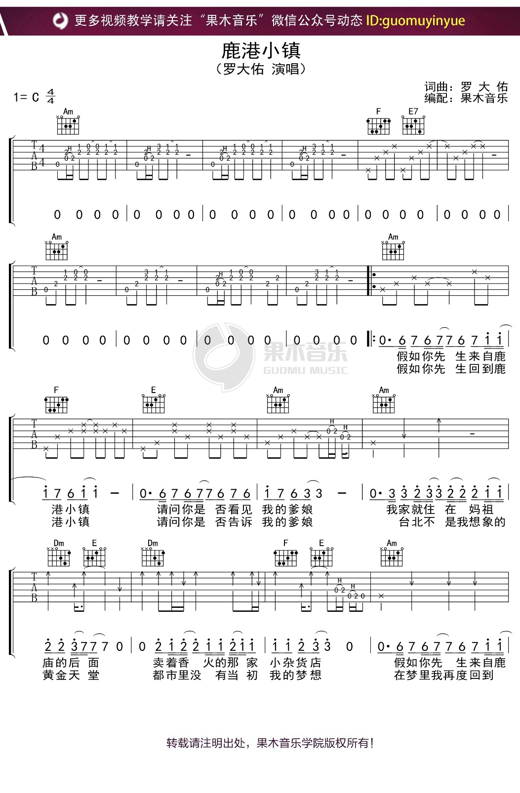 《罗大佑《鹿港小镇吉他谱》(C调)》内容来自于互联网,不能保证内容的准确性与完整性,仅供学习交流欣赏,请勿用于其它用途,内容版权归原作者及来源网站所有,如有侵犯到您的权益请来信告知,我们将及时删除。