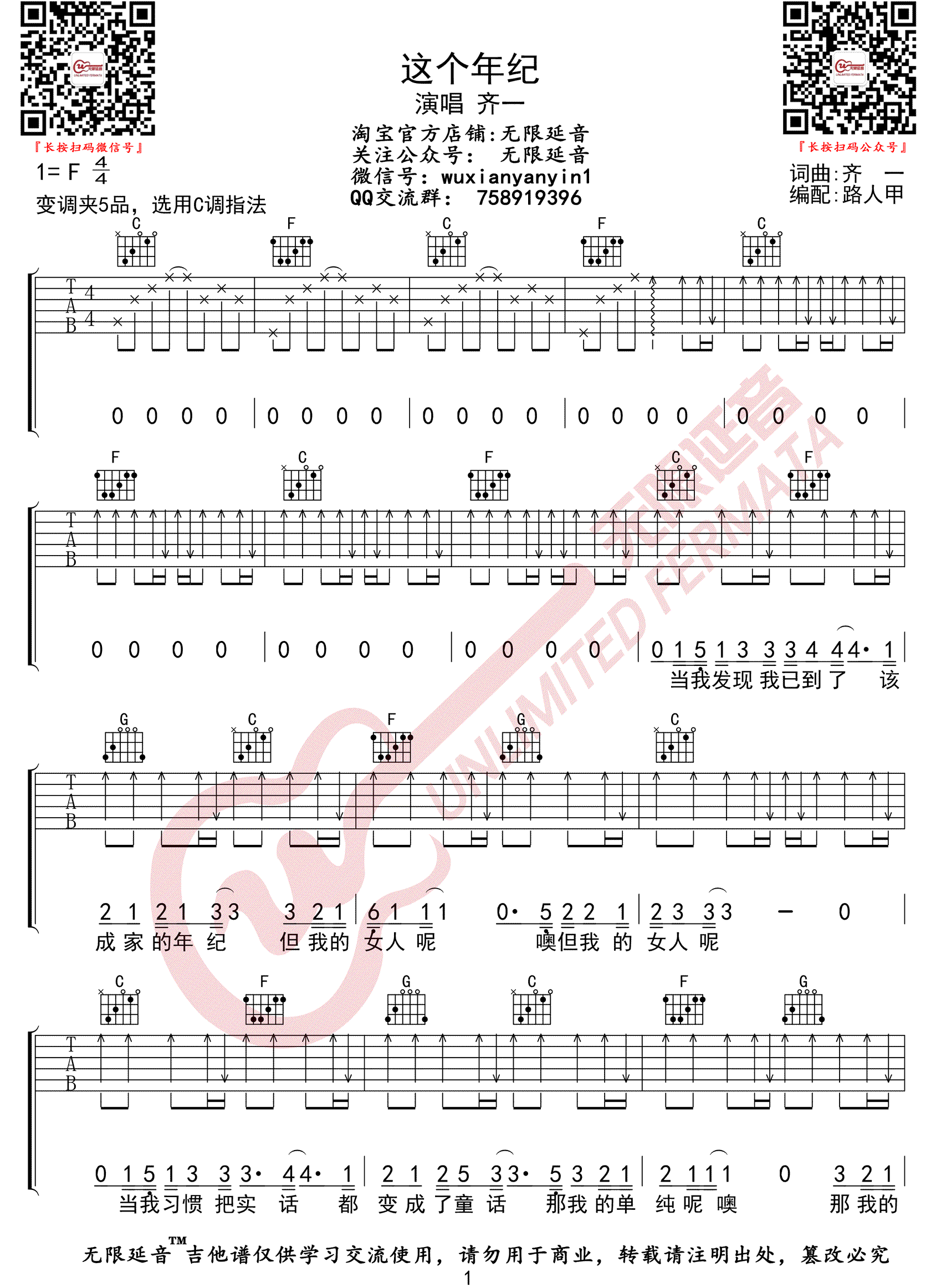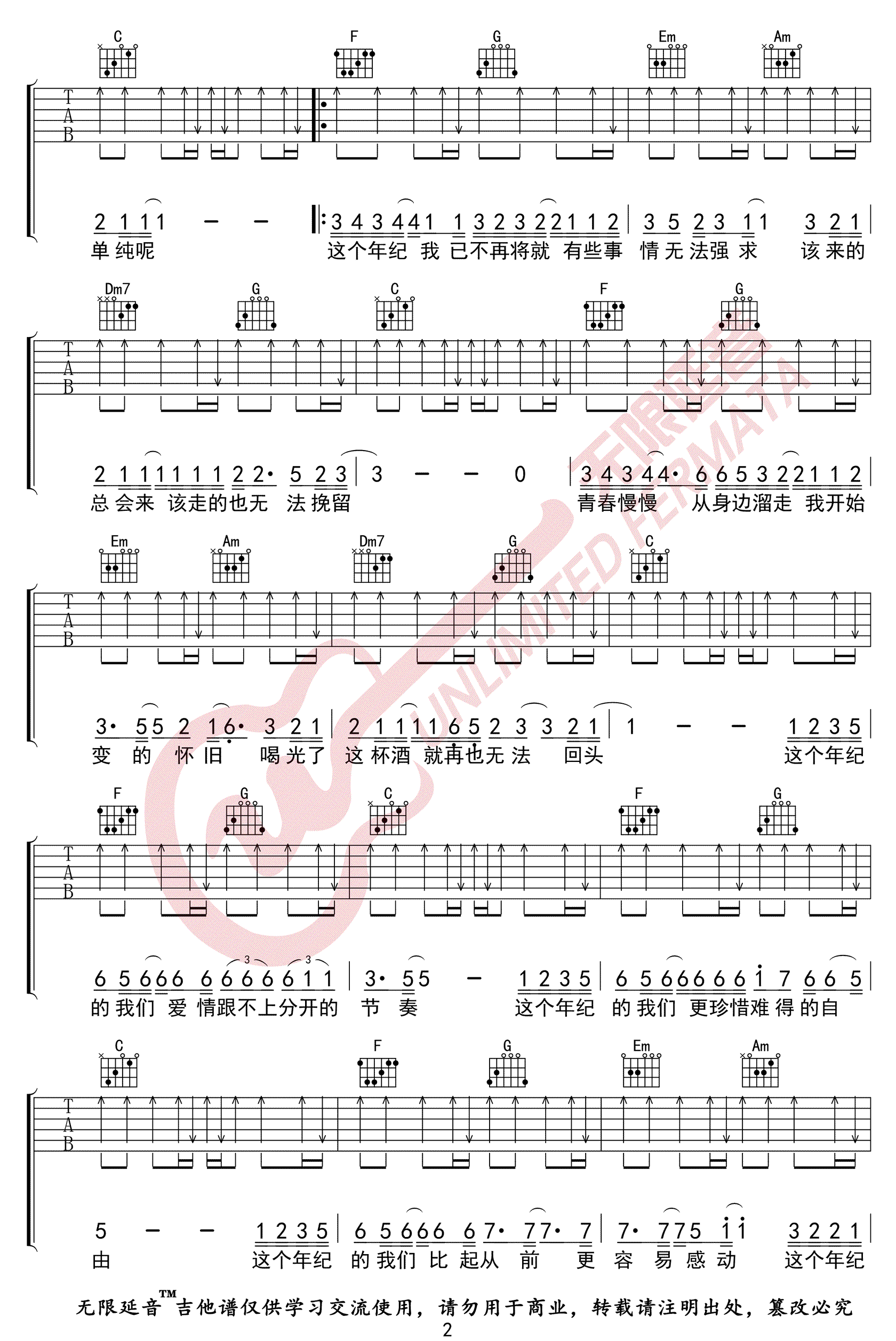 《齐一《这个年纪吉他谱》(G调)》内容来自于互联网,不能保证内容的准确性与完整性,仅供学习交流欣赏,请勿用于其它用途,内容版权归原作者及来源网站所有,如有侵犯到您的权益请来信告知,我们将及时删除。